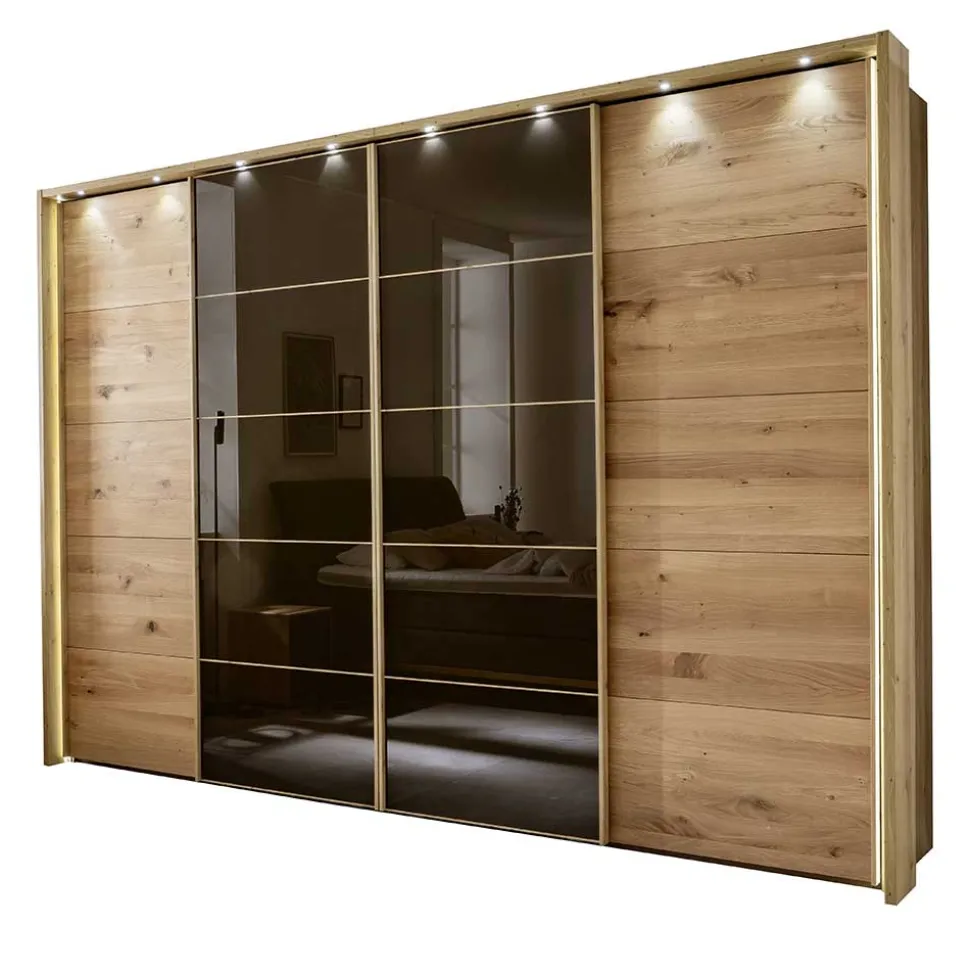 Die vier Schwebetüren mit Synchron-Öffnung ermöglichen ein leichtes und synchrones Öffnen und Schließen der Türen, ideal für Räume mit begrenztem Platzangebot. Die äußeren beiden Türfronten bestehen aus massivem Eichenholz, während die mittleren beiden Türfronten mit stilvollem, dunkelbraunem Glas beschichtet sind. Die langen Metallgriffleisten in Korpusfarbe unterstreichen das moderne Design und erleichtern die Handhabung.