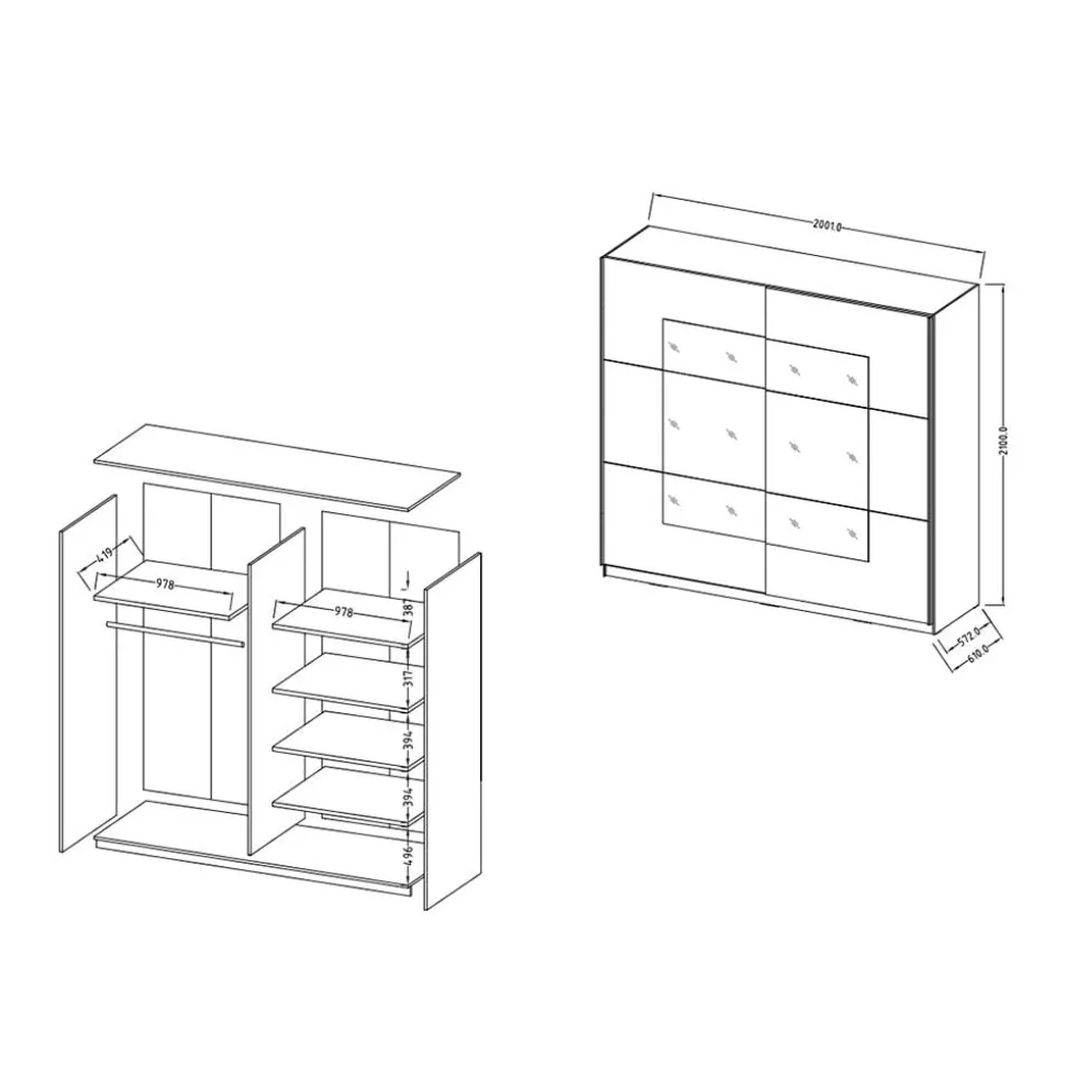 Mit einer Breite von 200 cm, einer Höhe von 210 cm und einer Tiefe von 61 cm bietet der Kleiderschrank „Anglivia“ jede Menge Stauraum. Die übersichtliche Einteilung sorgt dafür, dass Sie all Ihre Kleidung und Accessoires ordentlich verstauen können. Zwei leichtlaufende Schwebetüren ermöglichen einen komfortablen Zugang zum Innenraum, ohne zusätzlichen Platz zu beanspruchen. Schwebetüren haben den Vorteil, dass sie sich sanft und geräuschlos bewegen lassen, was besonders in Schlafzimmern wichtig ist, wo Ruhe und Entspannung im Vordergrund stehen.