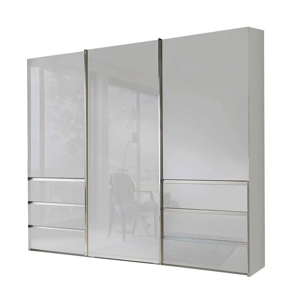 Die Fronten des Kleiderschranks sind mit Glas beschichtet, was nicht nur eine edle Optik verleiht, sondern auch besonders pflegeleicht ist. Das Innendekor in Silber-Grau gestreift rundet das hochwertige Erscheinungsbild ab und setzt zusätzliche Akzente. Die Chromfarbenen Metall-Griffleisten betonen den modernen Stil und ermöglichen ein müheloses Öffnen und Schließen der Türen.