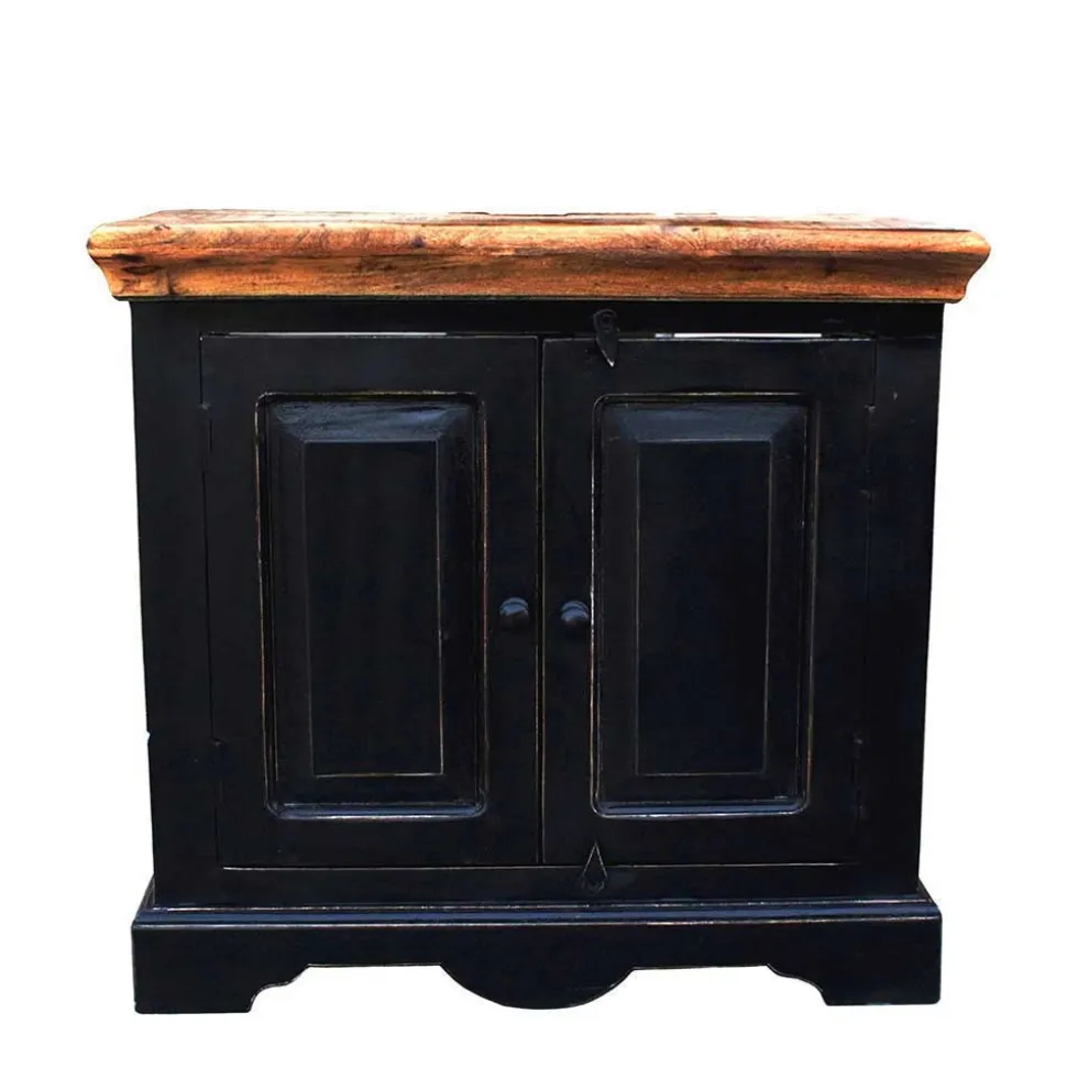 Die lackierten Oberflächen in schwarzem Antik Finish harmonieren perfekt mit den honigfarbig lackierten Deckplatten aus Massivholz und schaffen einen optisch ansprechenden Akzent, der das Gesamtbild unterstreicht. Die beabsichtigten Gebrauchsspuren verleihen jedem Stück einen einzigartigen und authentischen Charakter.