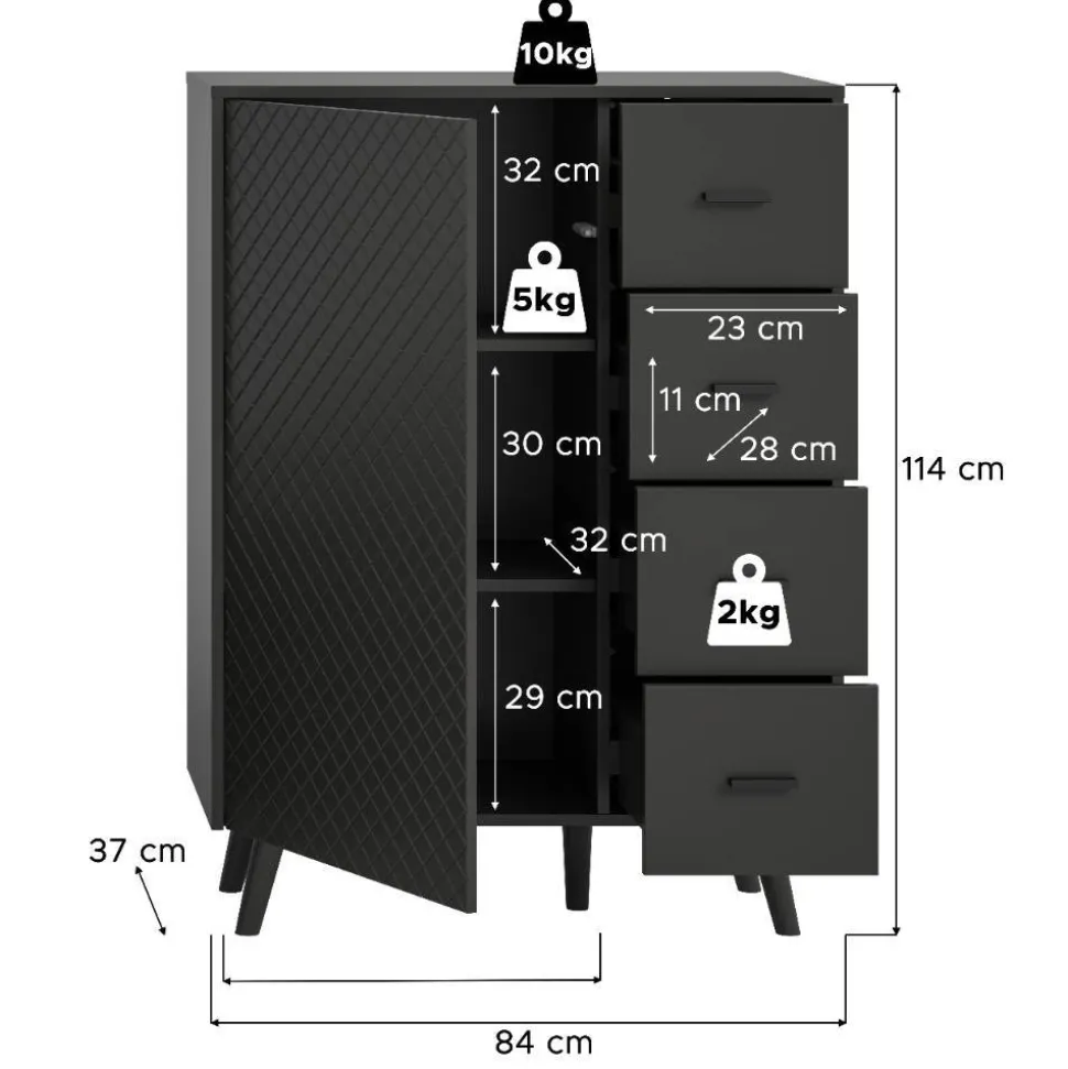 Hinter der links angeordneten Drehtür verbirgt sich ein vielseitig nutzbarer Stauraum: Zwei herausnehmbare, verstellbare Einlegeböden unterteilen das Fach in drei Bereiche – ideal, um Geschirr, Gläser oder Dekoartikel übersichtlich zu verstauen. Ein besonderes Designhighlight bildet das auf der Türfront eingefräste Karomuster, das dem Möbelstück eine exklusive, handwerklich anmutende Note verleiht. Rechts daneben befinden sich vier Schubladen mit leichtgängigen Metallauszügen, die zusätzlichen Platz für kleinere Gegenstände bieten und einen aufgeräumten Gesamteindruck unterstützen.