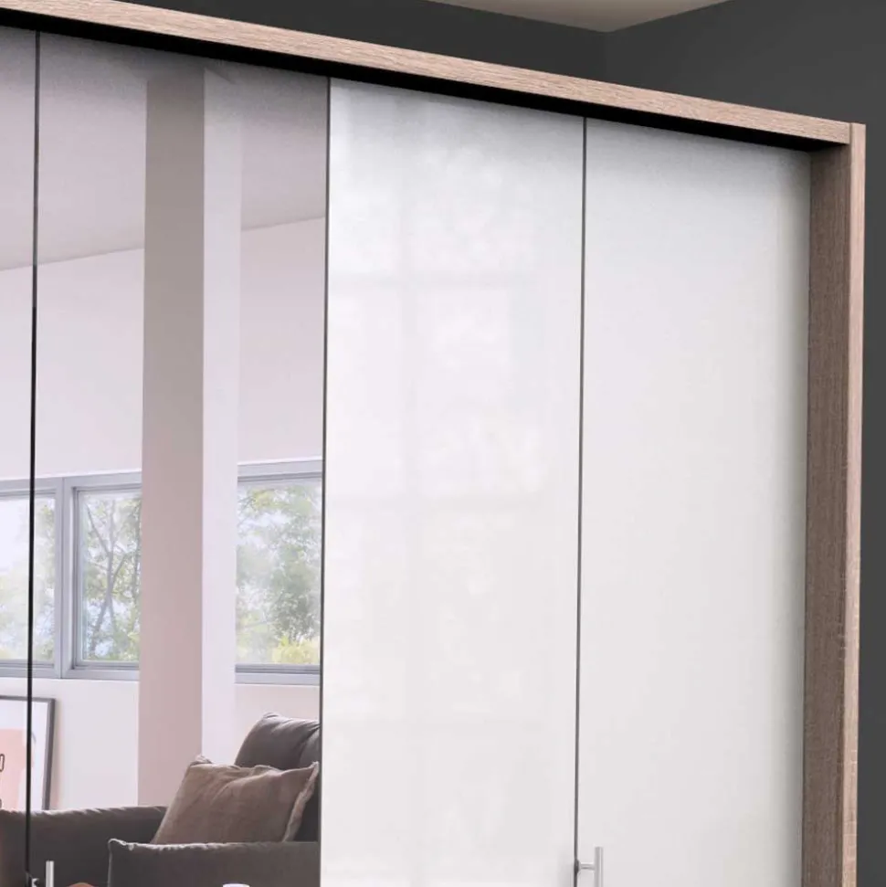Dank der drei Panorama-Falttüren in Sechs-Türen-Optik gestaltet sich das Öffnen und Schließen des Schranks spielend leicht. Die Türen werden einfach nach vorne gezogen und ermöglichen somit eine besonders platzsparende Handhabung. Die klare Formensprache des Designs verleiht dem Schrank eine zeitgemäße Ästhetik, die perfekt zu verschiedenen Einrichtungsstilen passt.