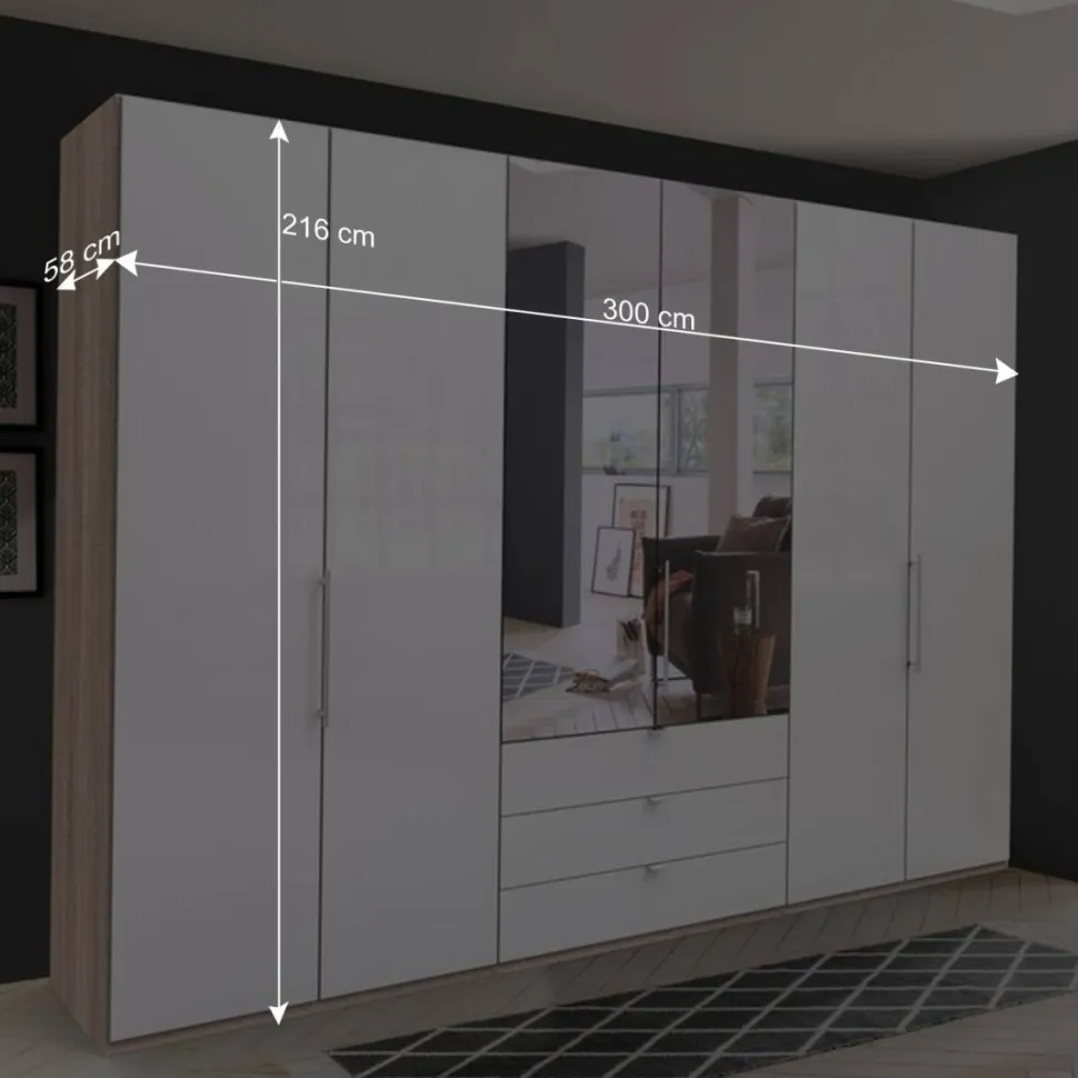 Mit Außenmaßen von 300 cm Breite, 58 cm Tiefe und 216 cm Höhe bietet der „Bosays II“ Kleiderschrank jede Menge Stauraum für Ihre Kleidung und Accessoires. Für noch mehr Raumgefühl und Eleganz können Sie optional den Passepartout-Rahmen hinzubuchen, der den Schrank auf großzügige 307 cm Breite und 220 cm Höhe erweitert.