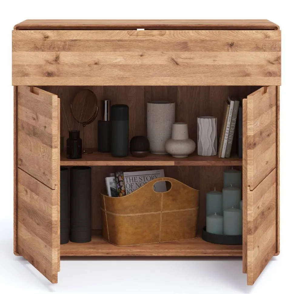Die Oberfläche der Kommode wurde mit einem hochwertigen, natürlichen Öl veredelt, das das Holz atmen lässt und seine charakteristische Struktur intensiv zur Geltung bringt. Das Ergebnis: eine samtig-warme Haptik, die nicht nur optisch begeistert, sondern auch haptisch ein Erlebnis bietet. Gleichzeitig wird das Holz geschützt, gepflegt und bleibt dauerhaft schön – ganz ohne künstlichen Glanz, dafür mit viel Gefühl für Natürlichkeit.
