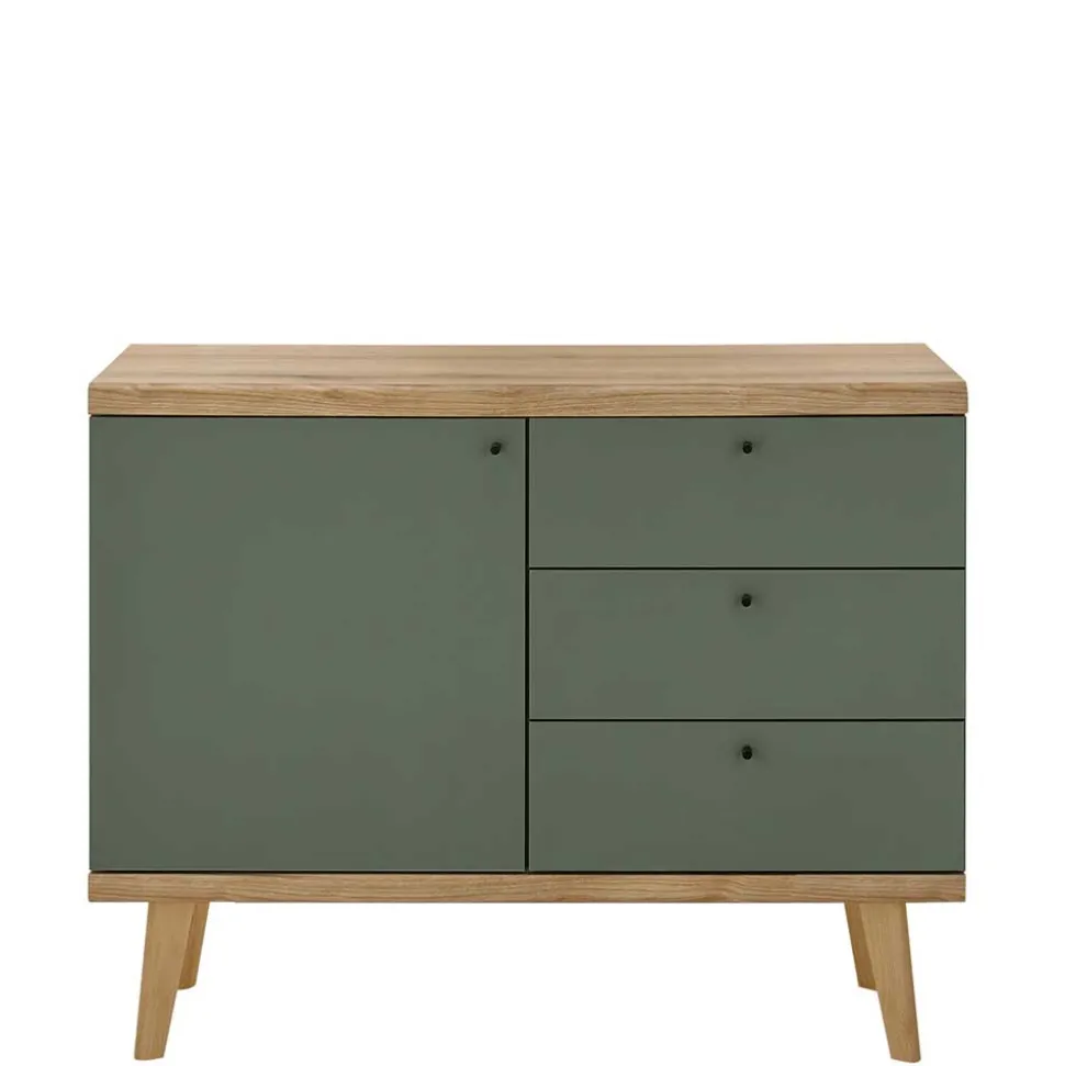 Hochwertige Materialien bilden das Fundament der Kommode „Oliva“. Gefertigt aus robustem Holzwerkstoff für den Korpus und die Fronten sowie massivem Holz für das Vierfußgestell, vereint dieses Möbelstück die besten Eigenschaften beider Materialien. Der Holzwerkstoff, bekannt für seine Stabilität und Langlebigkeit, bietet eine solide Grundlage für das Möbelstück. Zudem ist die Oberfläche mit einer Melaminharzbeschichtung veredelt, die in den Farben Graugrün und Wildeichefarben gehalten ist. Diese Beschichtung sorgt nicht nur für eine ansprechende Optik, sondern bietet auch einen hervorragenden Schutz gegen Kratzer, Feuchtigkeit und alltägliche Abnutzung. So bleibt die Kommode auch nach Jahren intensiver Nutzung noch in einem erstklassigen Zustand.