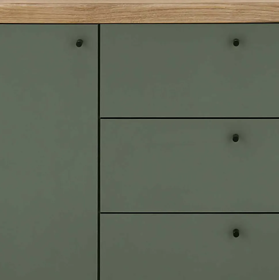 Flexibilität ist eine der größten Stärken der Kommode „Oliva“. Dank ihres durchdachten Designs fügt sie sich mühelos in verschiedenste Wohnstile ein – von modern bis klassisch, von skandinavisch bis industriell. Die harmonische Farbgebung in Graugrün und Wildeichefarben macht sie zu einem vielseitigen Möbelstück, das in jedem Raum einen besonderen Akzent setzt. Besonders der kontrastreiche Farbkontrast, kombiniert mit den natürlichen Holznuancen, verleiht Ihrem Zuhause eine warme und einladende Atmosphäre.