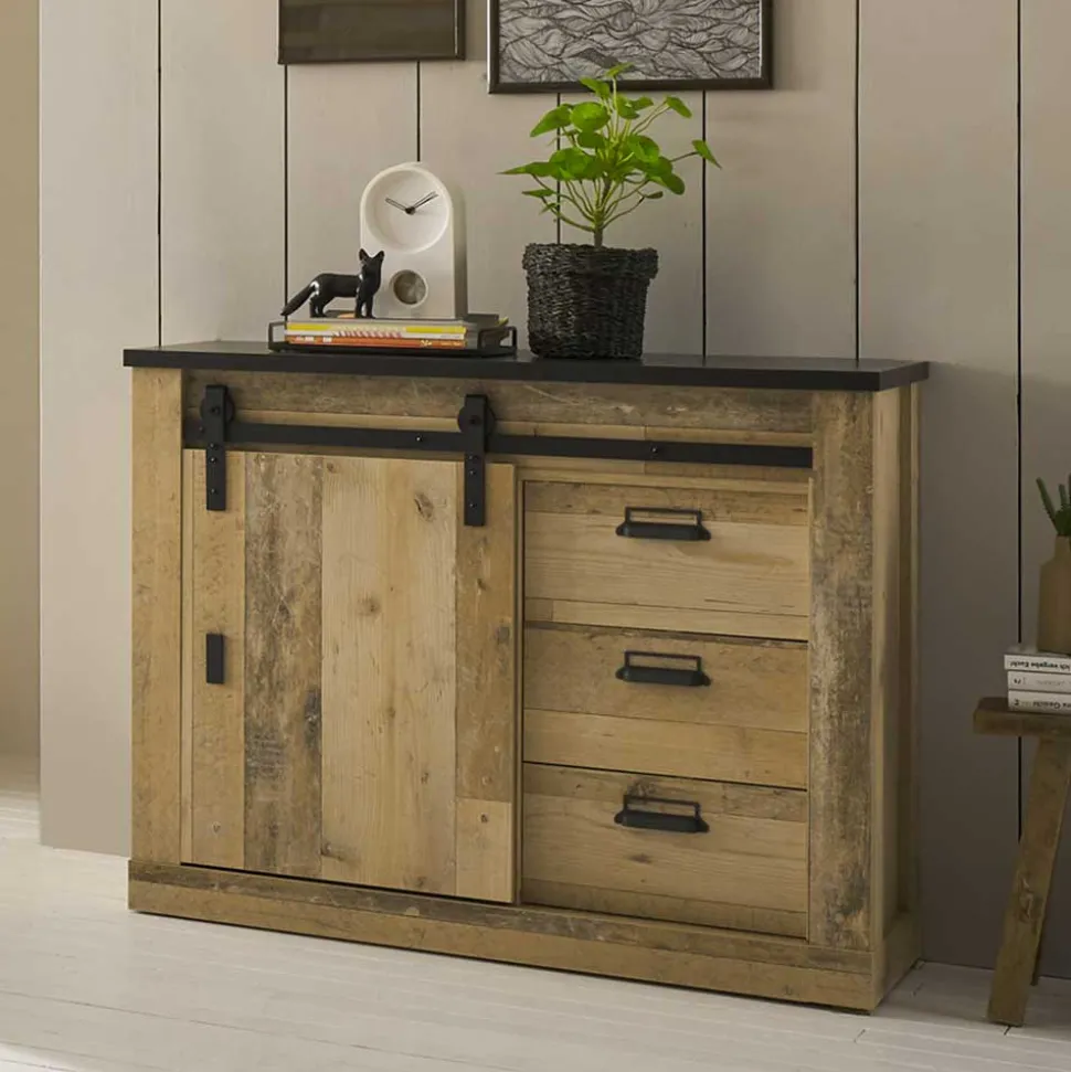 - Markante Kommode in Altholzoptik verwittert und Anthrazit