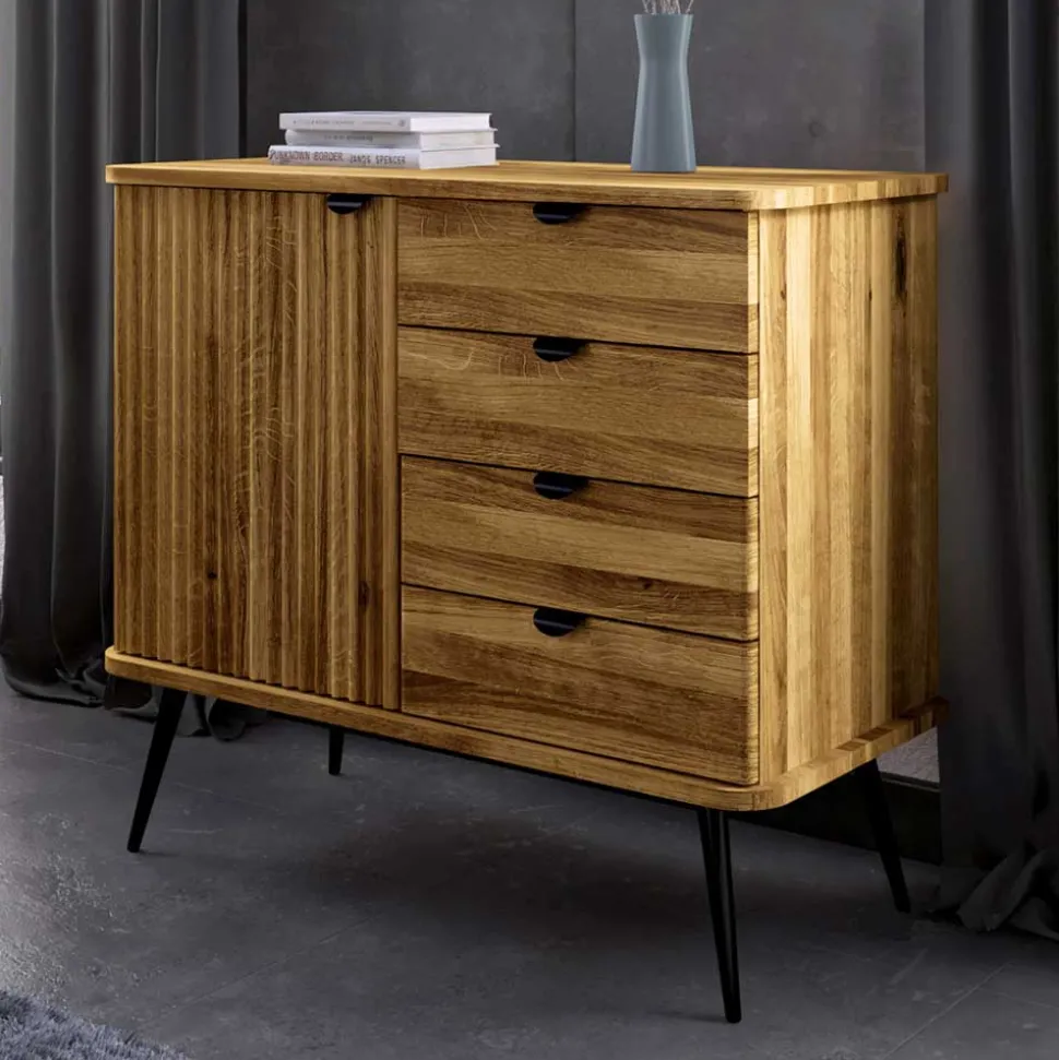 Die Kombination aus der warmen Wildeiche und dem kalten Stahl erzeugt ein modernes, kontrastreiches Design, das garantiert die Blicke auf sich zieht. Die Kommode besticht durch überstehende Decken- und Bodenplatten mit gerundeten Kanten, die der robusten Konstruktion einen weichen, organischen Touch verleihen. Mit einer Materialstärke von ca. 2 cm, besteht der Korpus und die Front aus durchgehenden Lamellen, die das Möbelstück optisch leicht und doch stabil erscheinen lassen.