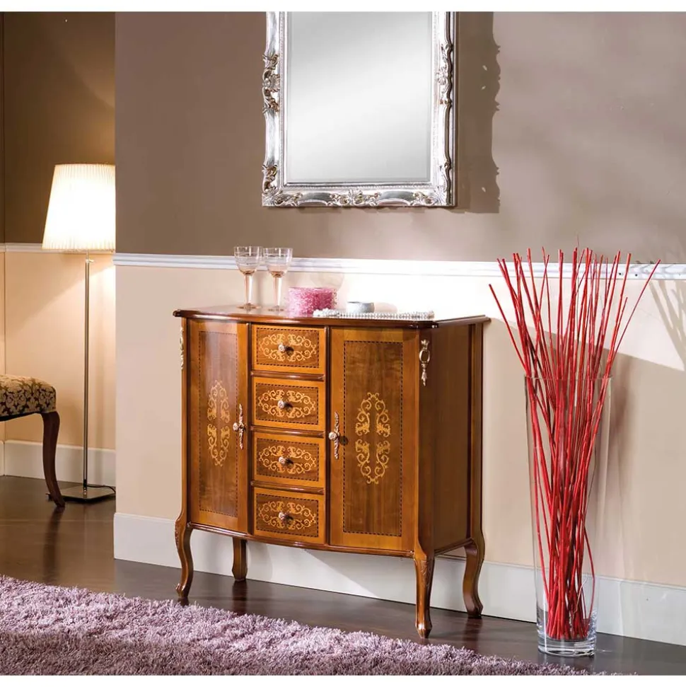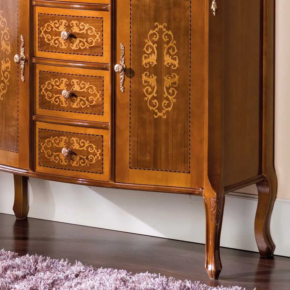 Die Oberflächen, veredelt mit echtem Nussbaumfurnier, strahlen Eleganz und Wohlgefühl aus. Jedes Detail, von den kunstvoll gestalteten Korpuskanten bis zu den handgearbeiteten Intarsien, zeugt von der Liebe zum Handwerk, die in dieses Möbelstück eingeflossen ist. Die goldfarbenen Metallgriffe und die seitlichen Verzierungen fügen eine zusätzliche Dimension des Luxus hinzu.