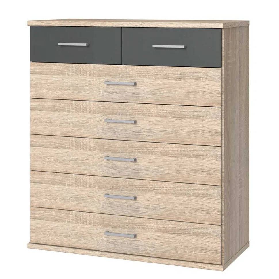 Mit ihrer stilvollen Kombination aus Eiche Sägerau und Dunkelgrau fügt sich die Hochkommode „Danah“ nahtlos in jedes Wohnambiente ein. Die neutrale Farbwahl ermöglicht eine problemlose Kombination mit anderen Möbelstücken und Accessoires. Die folierten Oberflächen bieten nicht nur eine ansprechende Holzoptik, sondern sind auch äußerst pflegeleicht und widerstandsfähig gegen Kratzer und Feuchtigkeit.