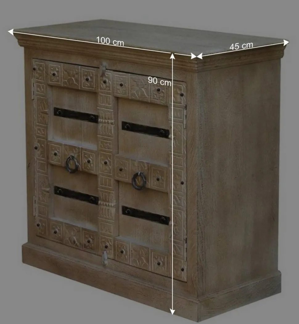Mit einer Breite von 100 cm, einer Höhe von 90 cm und einer Tiefe von 45 cm bietet die Kommode „Abid“ ausreichend Stauraum für Ihre persönlichen Schätze. Die beiden Türen lassen sich bequem mit Metallscharnieren und Holzknebeln verschließen, während hinter den Türen ein praktischer Einlegeboden Platz für Ihre Utensilien bietet. Die schwarzen Metall-Ringgriffe an den Türen fügen sich nahtlos in das Gesamtdesign ein.