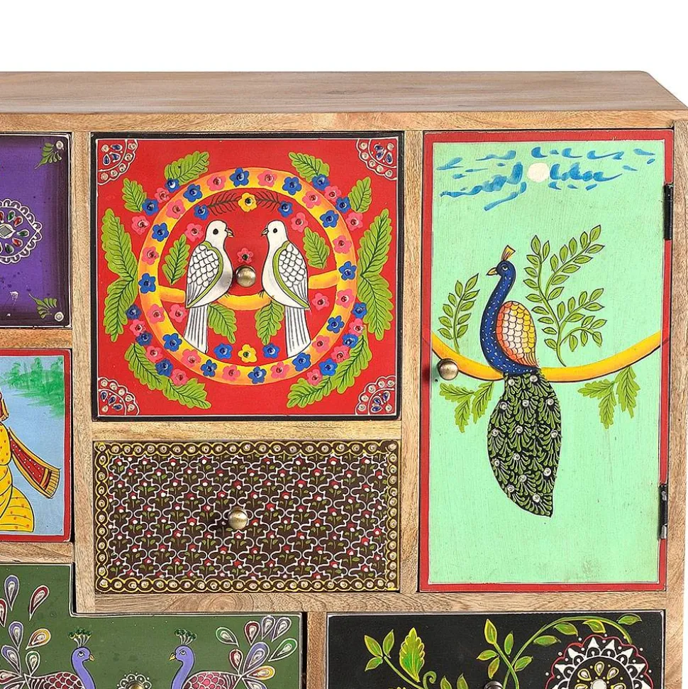 Mit der Kommode „Precio“ holen Sie sich einen außergewöhnlichen Blickfang in Ihre vier Wände. Die Kombination aus warmem Mangoholz in Naturfarbe und einer kunstvoll handbemalten Front mit farbenfrohen, orientalischen Mustern verleiht jedem Raum eine ganz besondere Atmosphäre. Jede Kommode ist ein echtes Unikat und überrascht mit individuellen Farbnuancen und Details, die das Möbelstück unverwechselbar machen. Der Charme dieses besonderen Designs fügt sich hervorragend in vielseitige Wohnkonzepte ein und bringt einen Hauch Exotik in Ihr Zuhause.