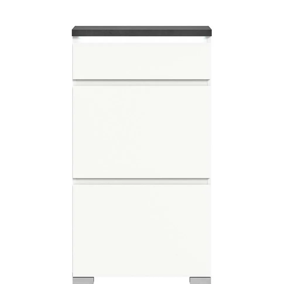 Weiß und Dunkelgrau, eine Farbkombination, die schlichte Eleganz und Modernität ausstrahlt. Der Korpus und die Fronten des Schuhschranks erstrahlen in einem klaren, pflegeleichten Weiß, während die Deckplatte in einem eleganten Dunkelgrau Akzente setzt. Diese harmonische Farbgebung macht den Schuhschrank zu einem vielseitigen Möbelstück, das sich mühelos in verschiedene Einrichtungsstile integrieren lässt, sei es modern, skandinavisch oder klassisch.