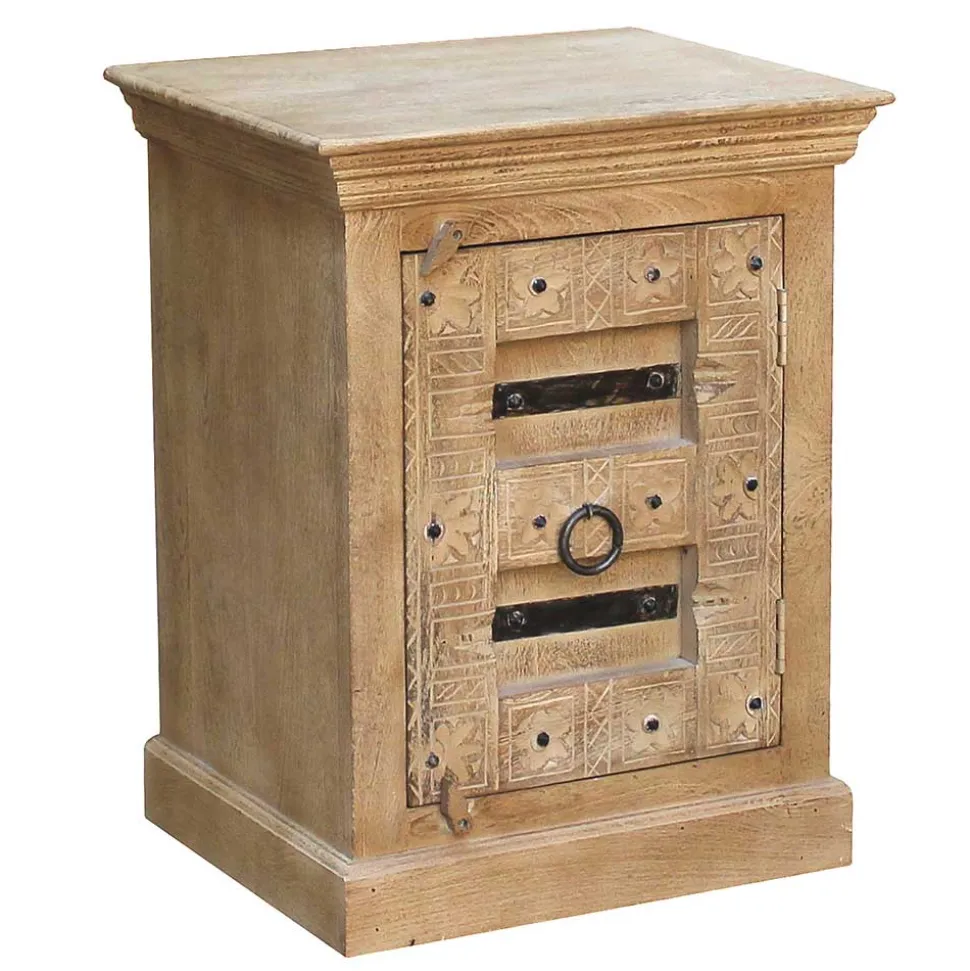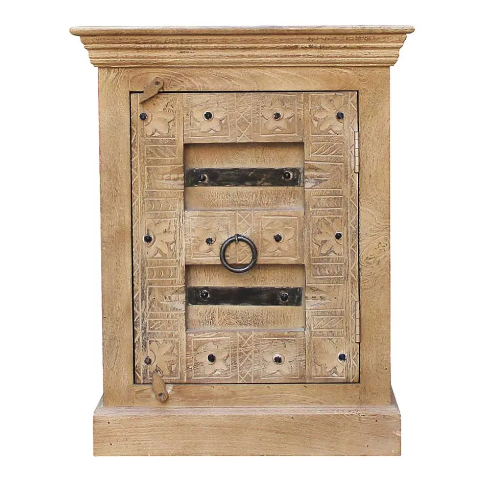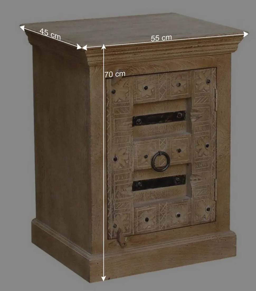 Mit einer Größe von 55 cm Breite, 70 cm Höhe und 45 cm Tiefe bietet die Kommode „Abid“ ausreichend Stauraum und fügt sich harmonisch in unterschiedliche Raumkonzepte ein. Die Tür, versehen mit Metallscharnieren und Holzknebeln, schützt den Inhalt und ergänzt das rustikale Design. Im Inneren sorgt ein Einlegeboden für Ordnung. Die schwarzen Metall-Ringgriffe an der Tür erleichtern das Öffnen und Schließen.