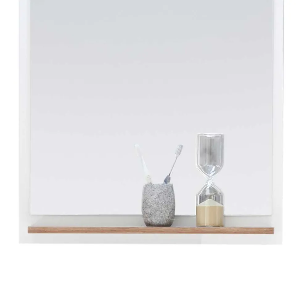 Der Spiegel kommt mit einem eleganten weißen Rahmen und einer praktischen Ablage in Eiche Natur Holzoptik, ergänzt durch eine LED-Aufsatzleuchte. Mit den Maßen von ca. 30×5,4×10 cm ist er nicht nur ein Blickfang, sondern auch äußerst funktional. Die Wandmontage erfolgt mühelos mit dreidimensional justierbaren Hängebeschlägen. Der Waschbeckenunterschrank ist mit einer hochwertigen Tür ausgestattet, die über Soft-Close-Beschläge aus Metall verfügt. Im Inneren finden Sie ein großes Fach sowie zwei offene Fächer in Eiche Natur Holzoptik, ideal zur Aufbewahrung von Badutensilien. Zudem können Sie die Tür nach Belieben montieren, um Ihre individuellen Anforderungen zu erfüllen. Der Bad-Hängeschrank bietet dank zweier verstellbarer Einlegeböden aus Glas drei Fächer und lässt sich ebenfalls flexibel anpassen.