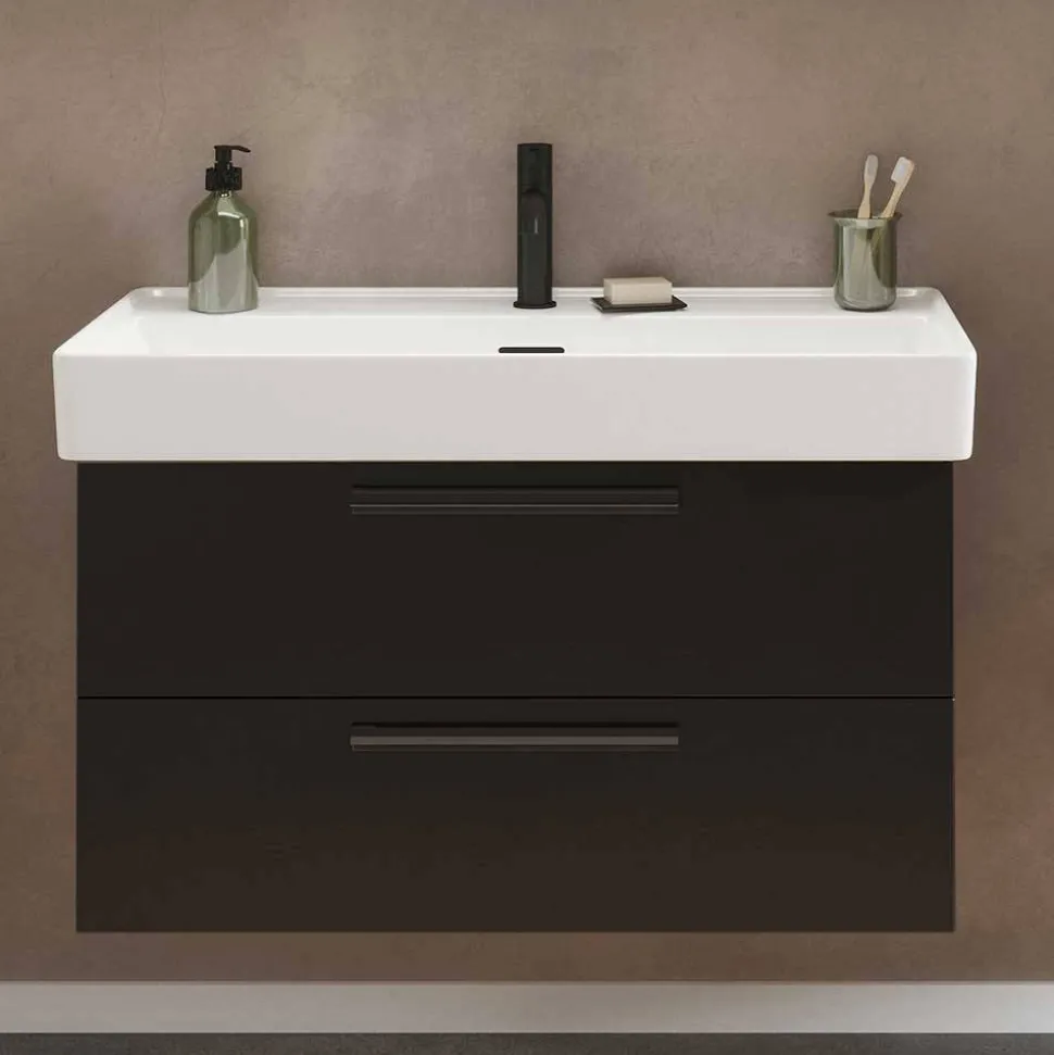 Schlicht, markant und voller Charakter – der Komplett-Waschtisch „Ostoro“ bringt mit seiner klaren Linienführung und der tiefschwarzen Farbgebung eine exklusive Note in Ihr Badezimmer. Das geradlinige Design wird durch die schwebende Wandmontage zusätzlich betont und verleiht dem Raum eine moderne Leichtigkeit. Gefertigt in Deutschland, überzeugt dieses Möbelstück mit hochwertiger Verarbeitung und funktionalen Details, die den Alltag komfortabler machen.