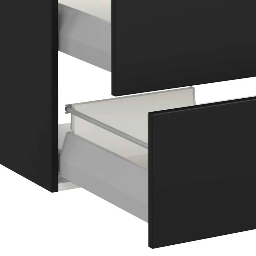 Hergestellt aus robustem MDF, bietet der Waschtisch eine langlebige und pflegeleichte Oberfläche. Außen präsentiert sich „Ostoro“ in einer edlen schwarzen Folierung, die nicht nur optisch überzeugt, sondern auch widerstandsfähig gegenüber Feuchtigkeit ist. Die Innenseiten der Schränke sind in Weiß gehalten, was für eine helle und freundliche Optik im Inneren sorgt. Die tiefgezogenen Kanten verstärken die Stabilität und verleihen dem Möbelstück eine hochwertige Haptik.