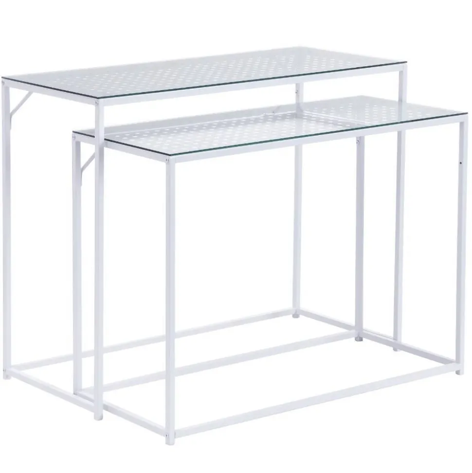 Mit dem Konsolentisch-Set Duo „Marian“ holen Sie sich gleich zwei formschöne Hingucker in Ihr Zuhause. Das puristische Design mit klaren Linien und der harmonischen Farbgebung in Weiß und Transparent sorgt für Leichtigkeit und moderne Eleganz. Ob im Flur, im Wohnzimmer oder im Schlafbereich – die beiden Tische passen sich mühelos jedem Raumkonzept an und wirken stets freundlich und unaufdringlich. Besonders praktisch: Der kleinere Tisch lässt sich einfach unter den größeren schieben – ideal, wenn Sie einmal mehr Platz benötigen oder Wert auf flexible Einrichtungslösungen legen.