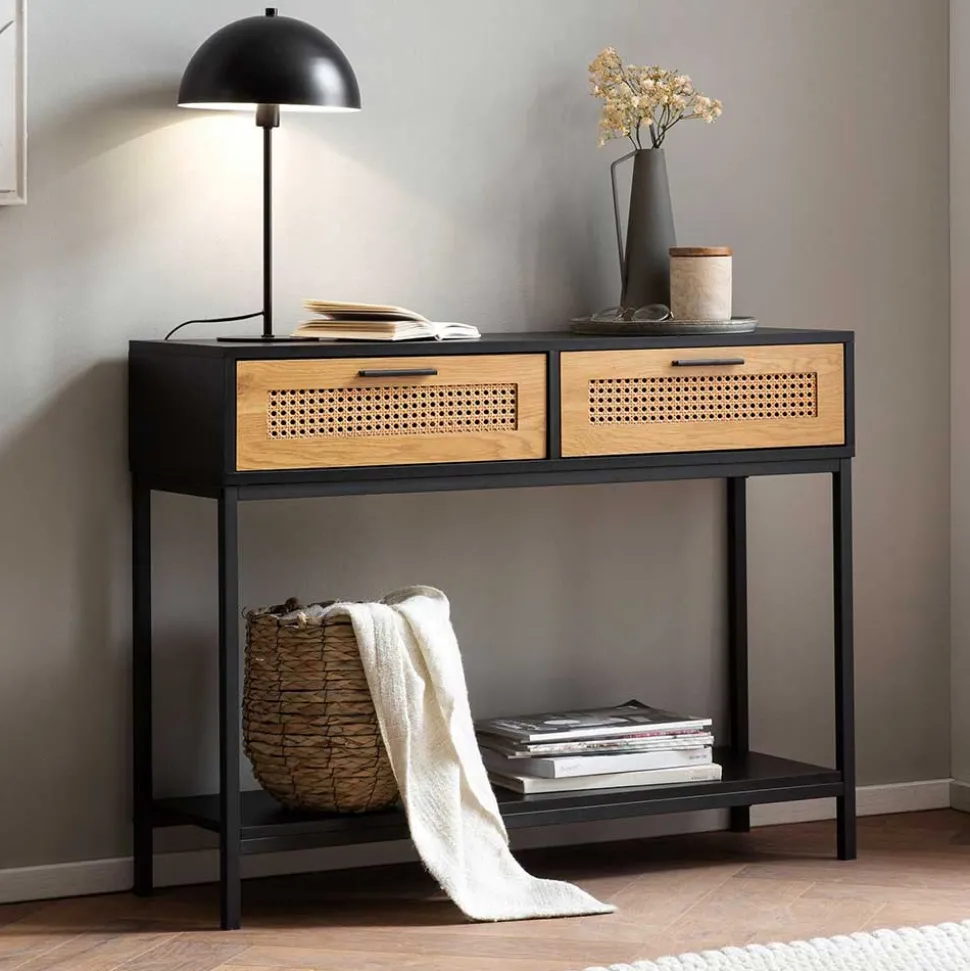 Der Konsolentisch besticht durch seine durchdachte Materialauswahl. Hergestellt aus robustem MDF, Kunstrattan und Metall, bietet er nicht nur eine ansprechende Optik, sondern auch eine hohe Stabilität. Die Oberflächen sind entweder in einer eleganten Holzoptik foliert oder in Schwarz melaminbeschichtet. Die Kombination dieser hochwertigen Materialien sorgt dafür, dass der Tisch sowohl ästhetisch als auch funktional überzeugt.