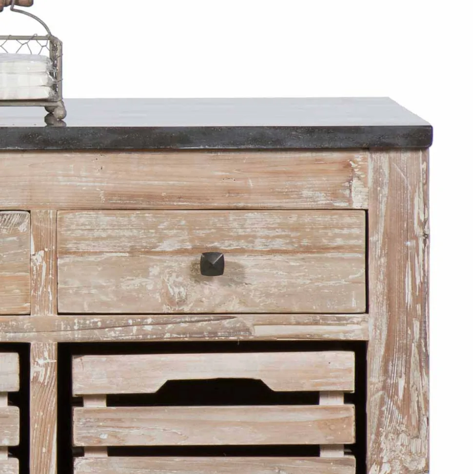 Mit einer Breite von 182 cm, einer Höhe von 89 cm und einer Tiefe von 82 cm bietet dieser Küchen-Arbeitstisch ausreichend Platz, um all Ihre Küchenutensilien übersichtlich zu verstauen und bequem zu arbeiten. Dank der großzügigen Arbeitsfläche aus dunklem Naturstein können Sie problemlos Vorbereitungen für das Kochen treffen, während die strapazierfähige Oberfläche leicht zu reinigen und extrem widerstandsfähig ist.