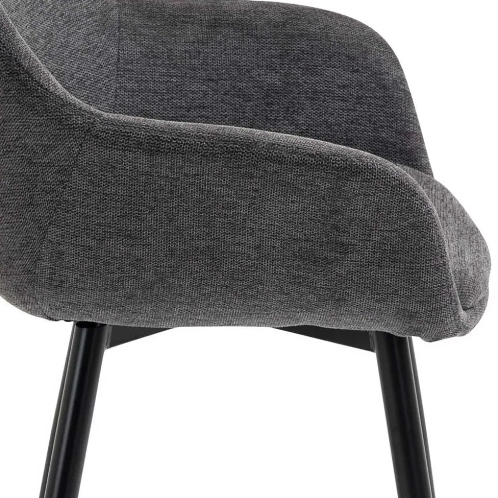 Die vier Stühle dieser Gruppe bieten nicht nur eine ansprechende Optik, sondern auch höchsten Sitzkomfort. Bezogen mit einem strapazierfähigen Strukturwebstoff in elegantem Anthrazit (100 % Polyester), fügen sie sich stilvoll in jede Einrichtung ein. Eine weiche Schaumstoffpolsterung sorgt für angenehmen Sitzkomfort, während die ergonomisch geformte Rückenlehne mit leichter Neigung den Rücken optimal unterstützt. Mit einer Sitzhöhe von 47 cm, einer Sitztiefe von 44 cm und einer Sitzbreite von 44 cm laden diese Stühle zu langen, gemütlichen Stunden am Tisch ein. Die stabilen, konisch zulaufenden Beine aus pulverbeschichtetem Metall in Schwarz sorgen für sicheren Stand und eine moderne Ästhetik.