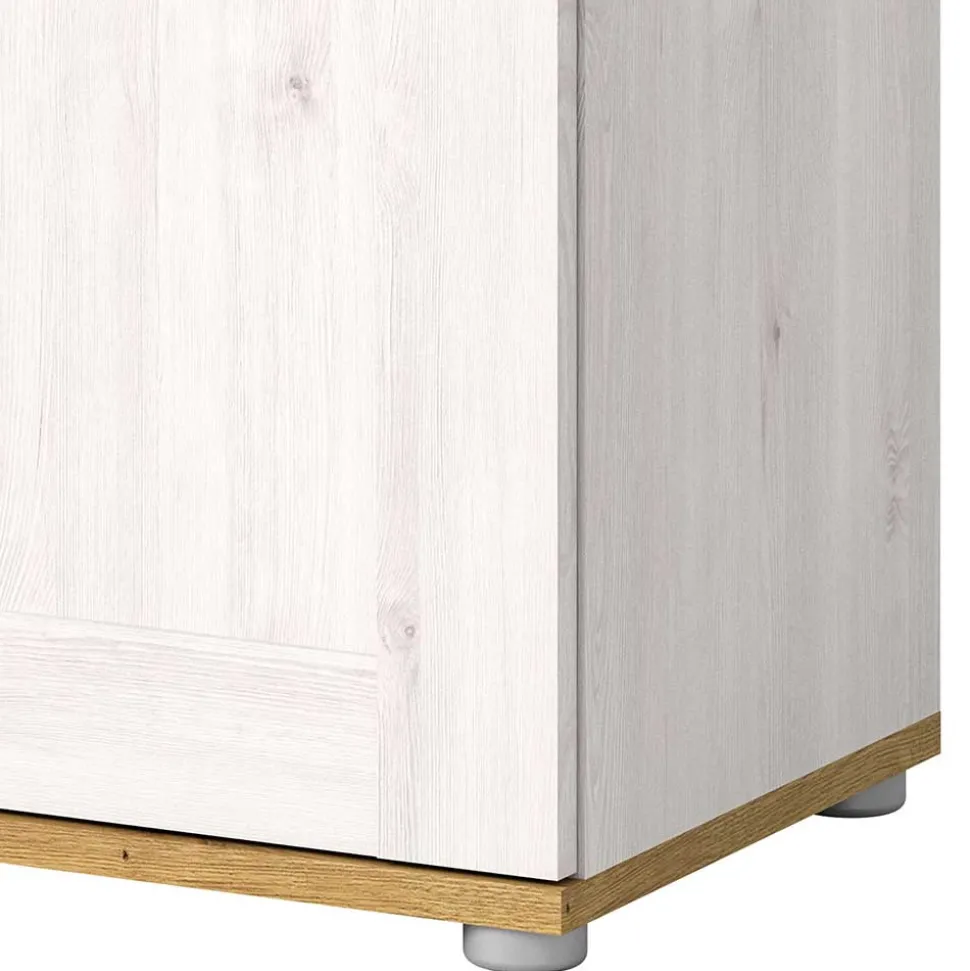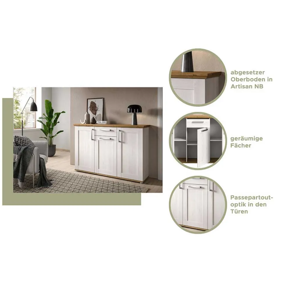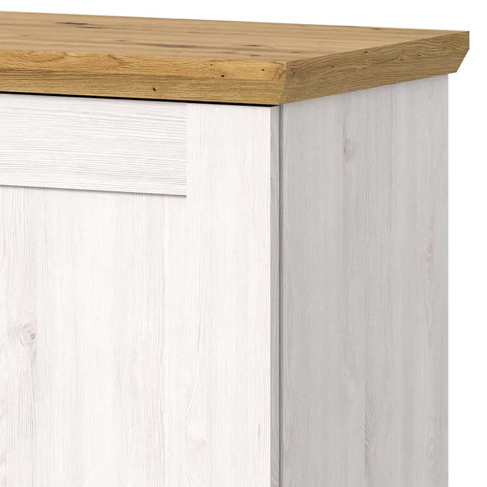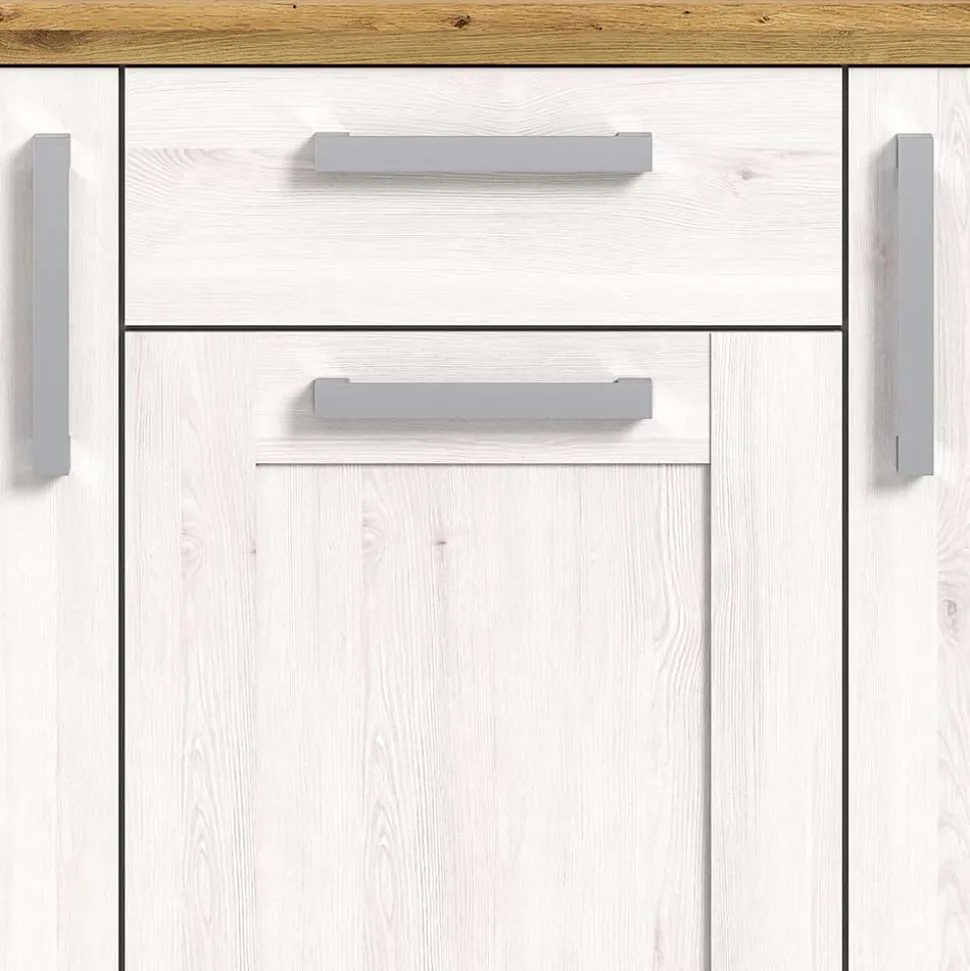 Die Front in weißer Lärche-Holzoptik mit stilvoller Kassettenstruktur verleiht dem Möbel eine liebevoll traditionelle Note. Absetzungen in Wildeiche-Dekor sorgen für einen natürlichen Kontrast und lassen die Anrichte zeitlos und hochwertig wirken. Silberfarbene Bügelgriffe aus Kunststoff fügen sich dezent in das Gesamtbild ein und unterstreichen den gemütlichen Landhausstil.