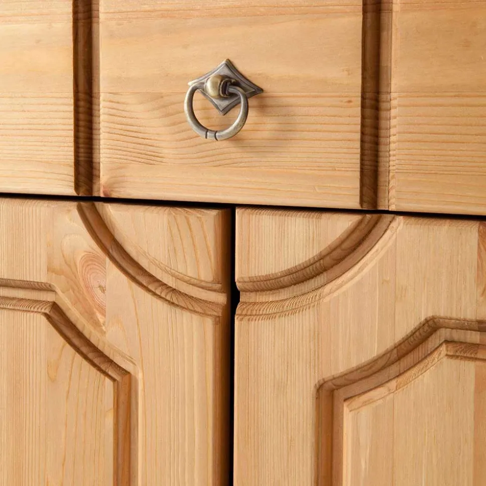 Gefertigt aus massivem Kiefernholz, zeichnet sich der Dielenschrank durch seine hochwertige Materialqualität aus. Das Kiefernholz überzeugt nicht nur durch seine Robustheit, sondern auch durch seine natürliche, lebendige Maserung, die bei jedem Möbelstück einzigartig ist. Die Oberfläche des Holzes wurde sorgfältig geölt, wodurch die Struktur des Holzes zusätzlich betont wird und das Material optimal geschützt ist. Ein großer Vorteil der geölten Oberfläche: Sie bleibt atmungsaktiv und sorgt dafür, dass das Holz weiterhin arbeiten kann, was seine Langlebigkeit erhöht.