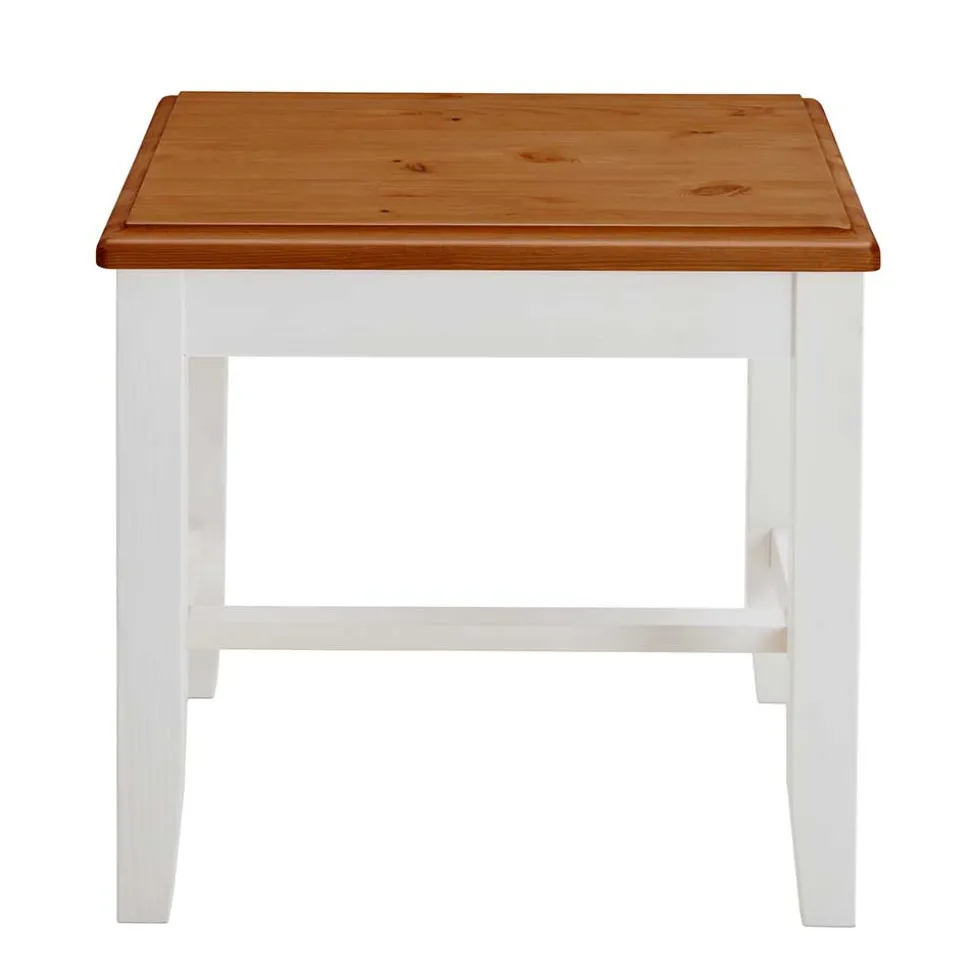 Der Landhaus Hocker „Garella“ ist aus hochwertigem Kiefer Massivholz gefertigt. Das robuste Material sorgt nicht nur für Stabilität, sondern verleiht dem Hocker auch eine natürliche Ausstrahlung. Die Oberflächen sind in Weiß lackiert, wobei die durchscheinende Maserung für einen charmanten Vintage-Effekt sorgt. Die bernsteinfarben gebeizten und lackierten Akzente setzen zusätzliche Highlights.