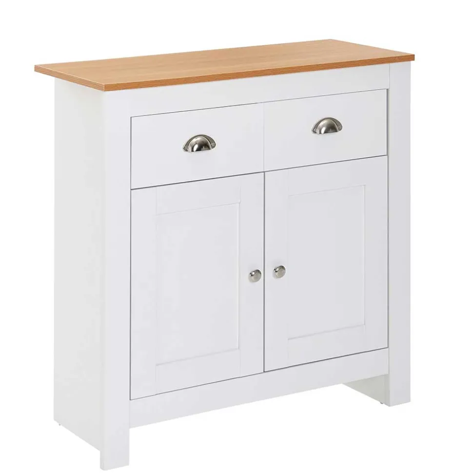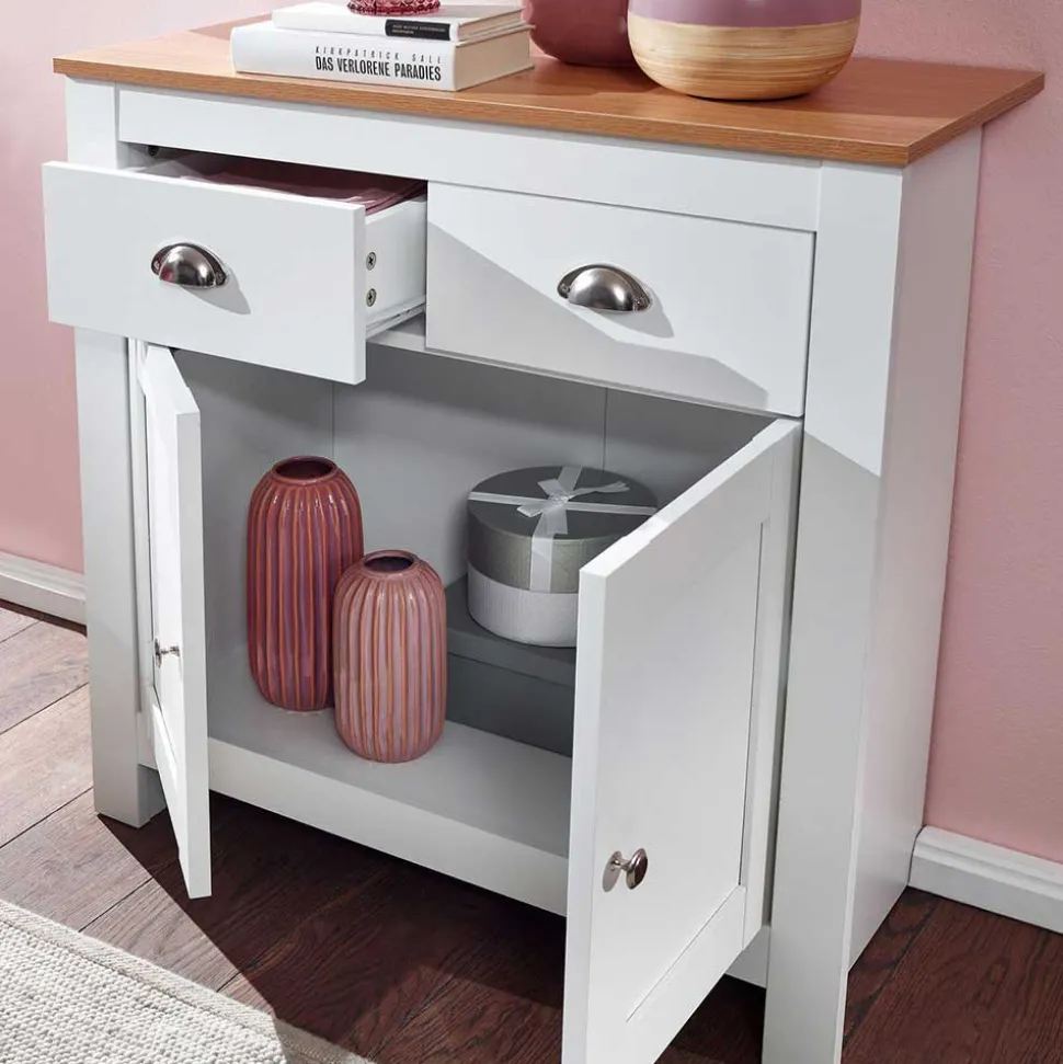 „Intora“ bietet großzügigen Platz für alles, was Sie griffbereit, aber dennoch ordentlich verstaut wissen wollen. Zwei leichtgängige Schubladen mit Metallauszügen sind ideal für kleinere Utensilien, während hinter den beiden Türen ein großes Fach wartet, das mit den Maßen von ca. 66x45x33,5 cm ausreichend Raum für Geschirr, Bücher, Textilien oder Deko bietet. Die hochwertigen Metallbeschläge und silberfarbenen Muschel- und Knopfgriffe runden das Bild elegant ab.