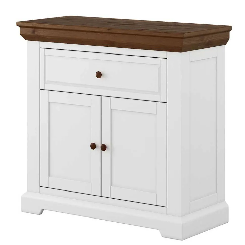 Die Kommode „Zalya“ wird aus robustem Kiefernholz gefertigt, das für seine natürliche Schönheit und Langlebigkeit bekannt ist. Die Oberfläche ist weiß lackiert, wobei die Maserung des Holzes dezent durchschimmert und für eine authentische Optik sorgt. Die braunen Elemente wurden sorgfältig gebeizt und lackiert, wodurch eine edle Kontrasterstellung zu den weißen Flächen entsteht. Das Holz ist nicht nur ein optisches Highlight, sondern auch besonders pflegeleicht und sorgt für eine angenehme Haptik. Der Einlegeboden im Inneren ist aus Holzwerkstoff, genauso wie der Schubladenboden, während die Rückwand aus robustem Material besteht. Die rund gearbeiteten Holzknopfgriffe ergänzen das Gesamtbild und verleihen der Kommode eine charmante, rustikale Note.