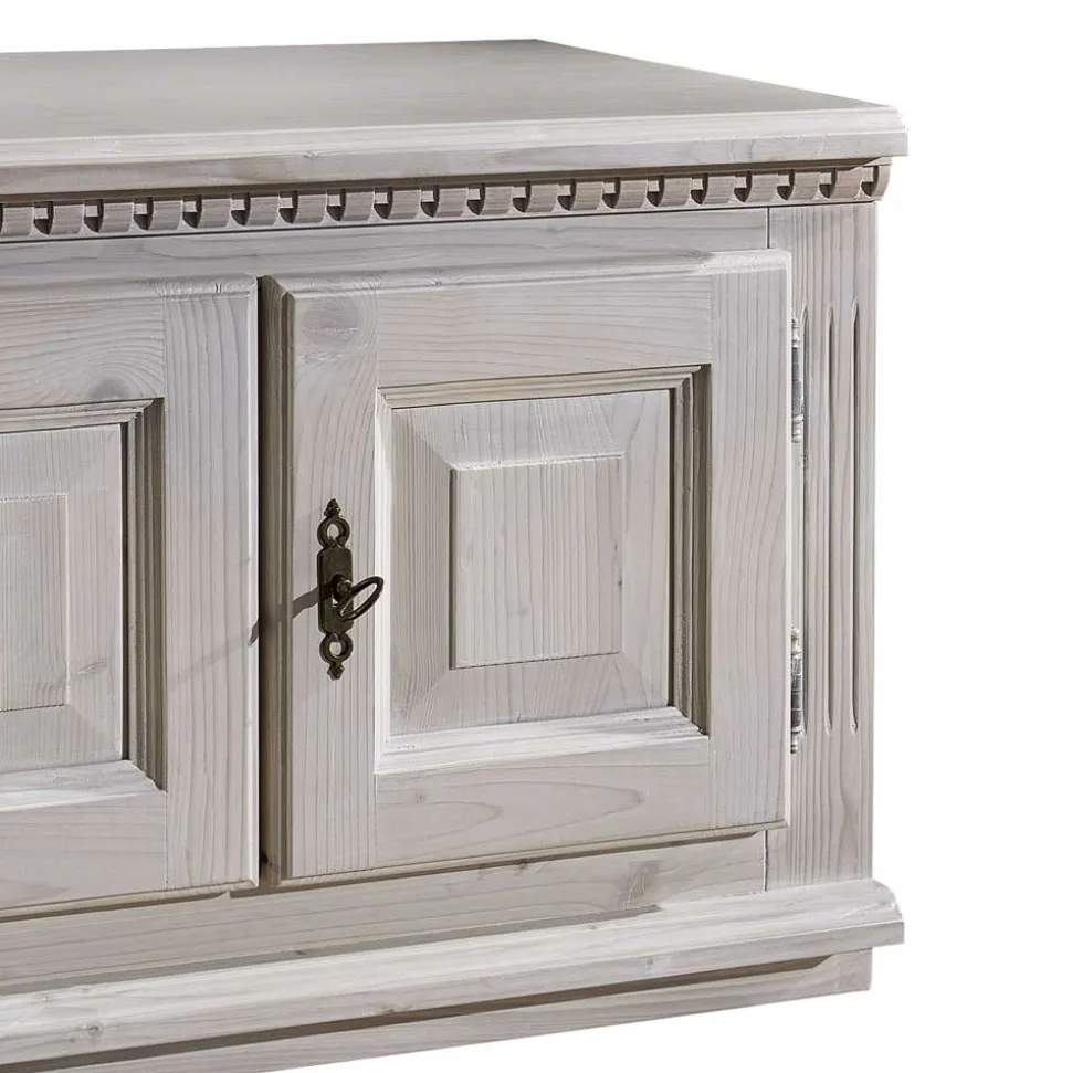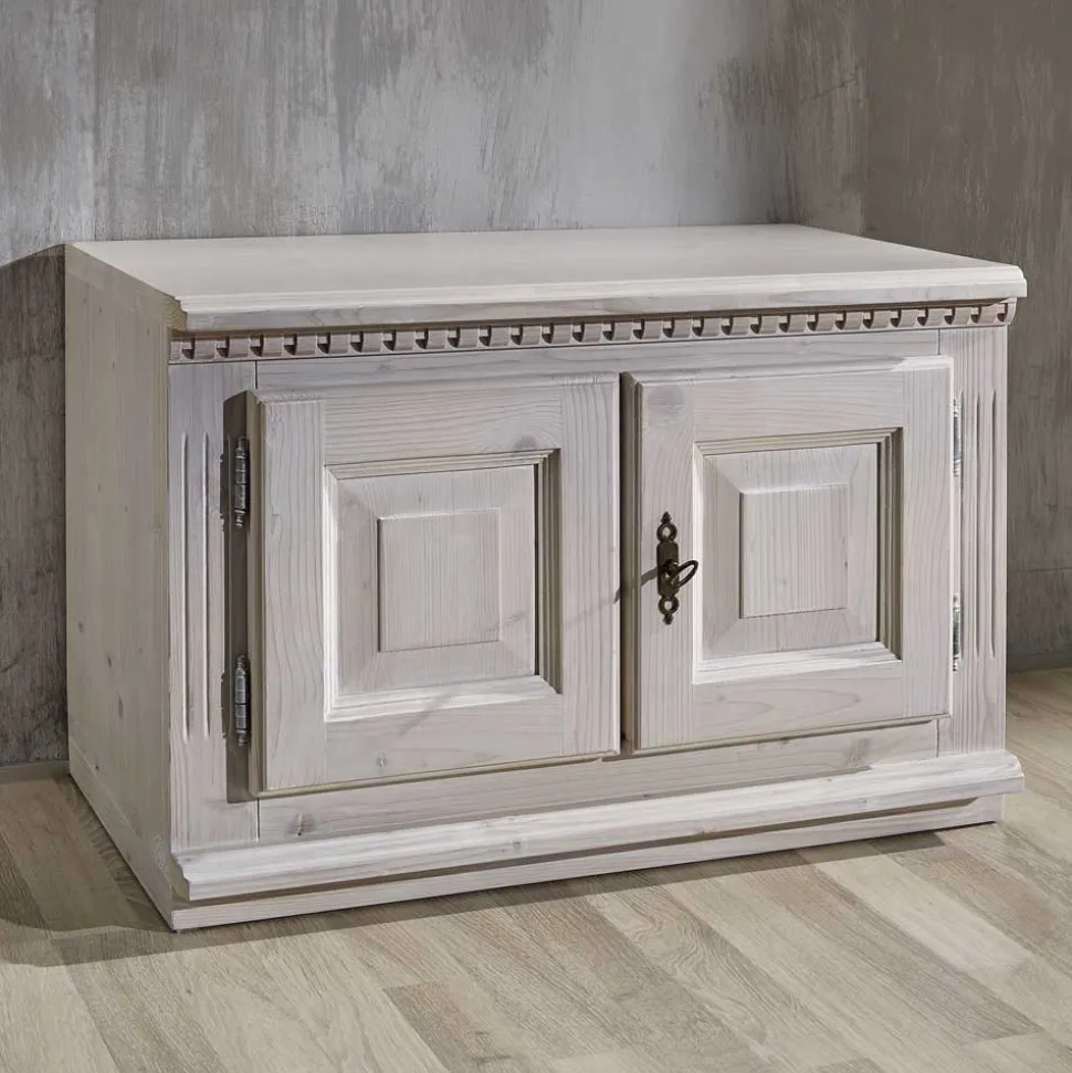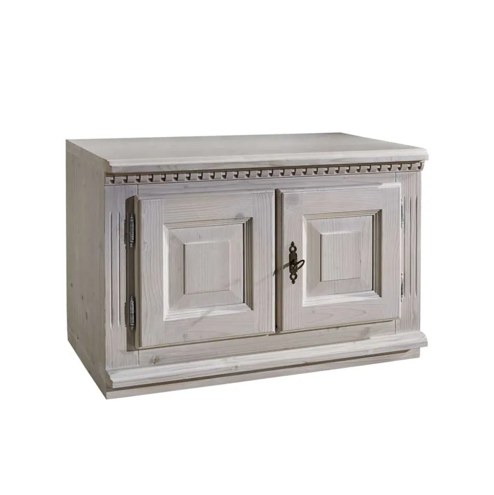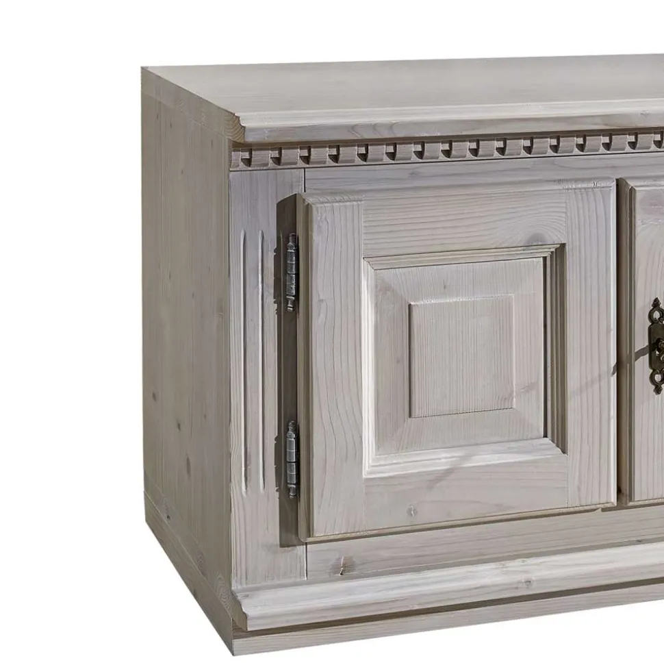 Die Frontseite des Unterschranks ist mit wunderschönen Fräsungen verziert, die von handwerklicher Präzision zeugen. Jedes Möbelstück ist ein Unikat, da die einzigartige Struktur und Farbe des Fichtenholzes jedem Unterschrank einen individuellen Charakter verleihen.