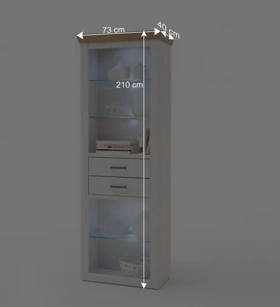 Die Front des Regals ist in weißer Pinie-Holzoptik tiefgezogen foliert und verleiht dem Regal einen natürlichen und warmen Charakter. Der Korpus und der Oberboden sind melaminbeschichtet, während der Oberboden noch zusätzlich optisch in Eiche Holzoptik abgesetzt ist. Mit seinen Abmessungen von 73 cm Breite, 210 cm Höhe und 40 cm Tiefe bietet das Regal ausreichend Platz für Ihre Lieblingsgegenstände und dekorativen Elemente.