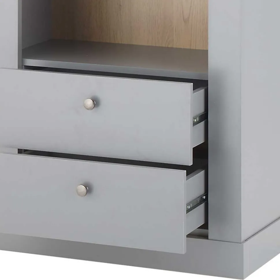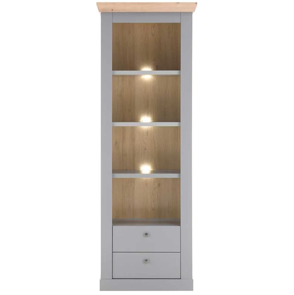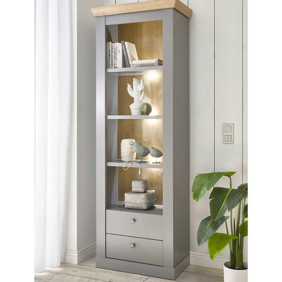 Die Kombination aus lichtgrauem Grundton und den Absetzungen in Eiche-Holzoptik schafft einen harmonischen und modernen Kontrast, der sich nahtlos in jede Einrichtung einfügt. Dieser ansprechende Farbkontrast bringt eine angenehme Leichtigkeit in den Raum und macht das Möbelstück zu einem echten Hingucker. Zudem können Sie sich auf eine gute und solide Material- und Verarbeitungsqualität verlassen, die das Regal zu einem treuen Begleiter für viele Jahre macht.