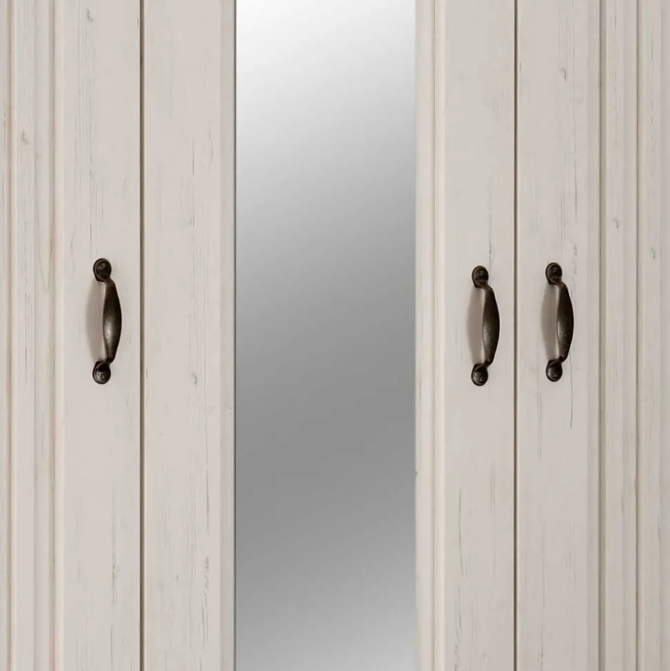 Das Schlafzimmer-Set „Malvissa I“ besticht durch seine liebevollen Details und durchdachten Funktionen. Die strukturierte Gestaltung der Türfronten und Bettseiten verleiht den Möbeln eine besondere Note und hebt sie von herkömmlichen Schlafzimmermöbeln ab. Die Deckplatten in Holzoptik Eiche setzen einen schönen Kontrast zum restlichen Weiß der Möbel und schaffen ein harmonisches Gesamtbild. Die nostalgischen Metall-Bügelgriffe in Schwarz unterstreichen den Landhausstil und sorgen gleichzeitig für eine einfache Handhabung.