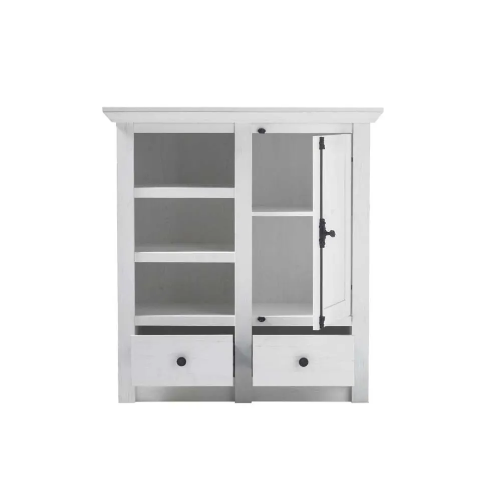 Als optischer Kontrast zum hellen Pinie Weiß sind die rustikalen Stangengriffe der Tür und die Knopfgriffe der Schubladen in Schwarz gehalten. Sie setzen edle Akzente und verleihen dem Möbelstück einen modernen Touch. „Chelles“ steht dabei auf einem geschlossenen Sockel, der für einen stabilen Stand sorgt und das Gesamtbild harmonisch abrundet.