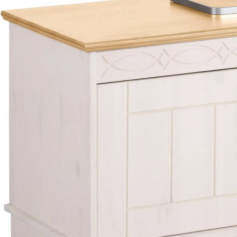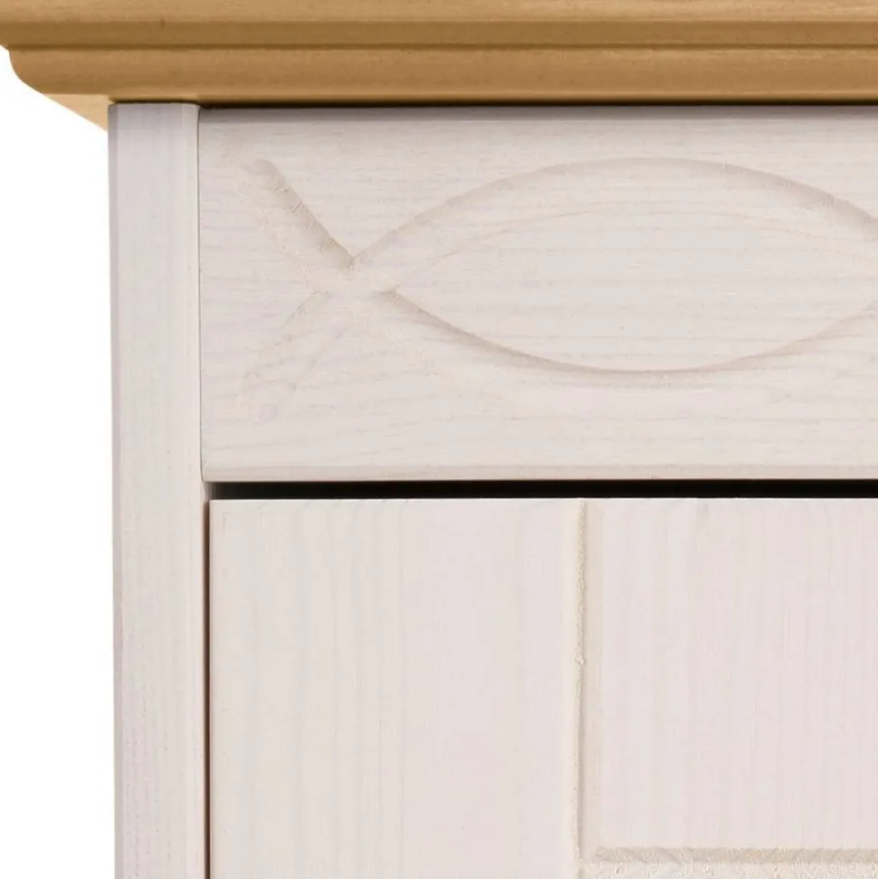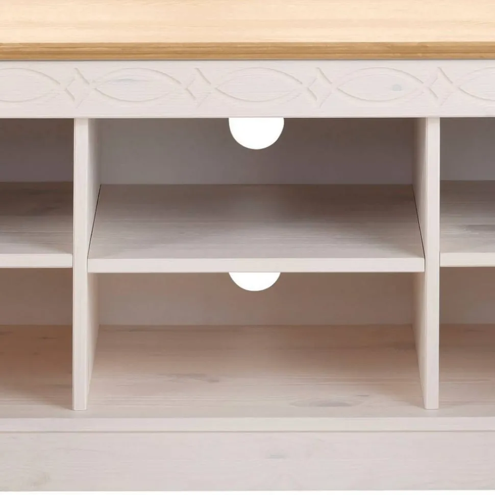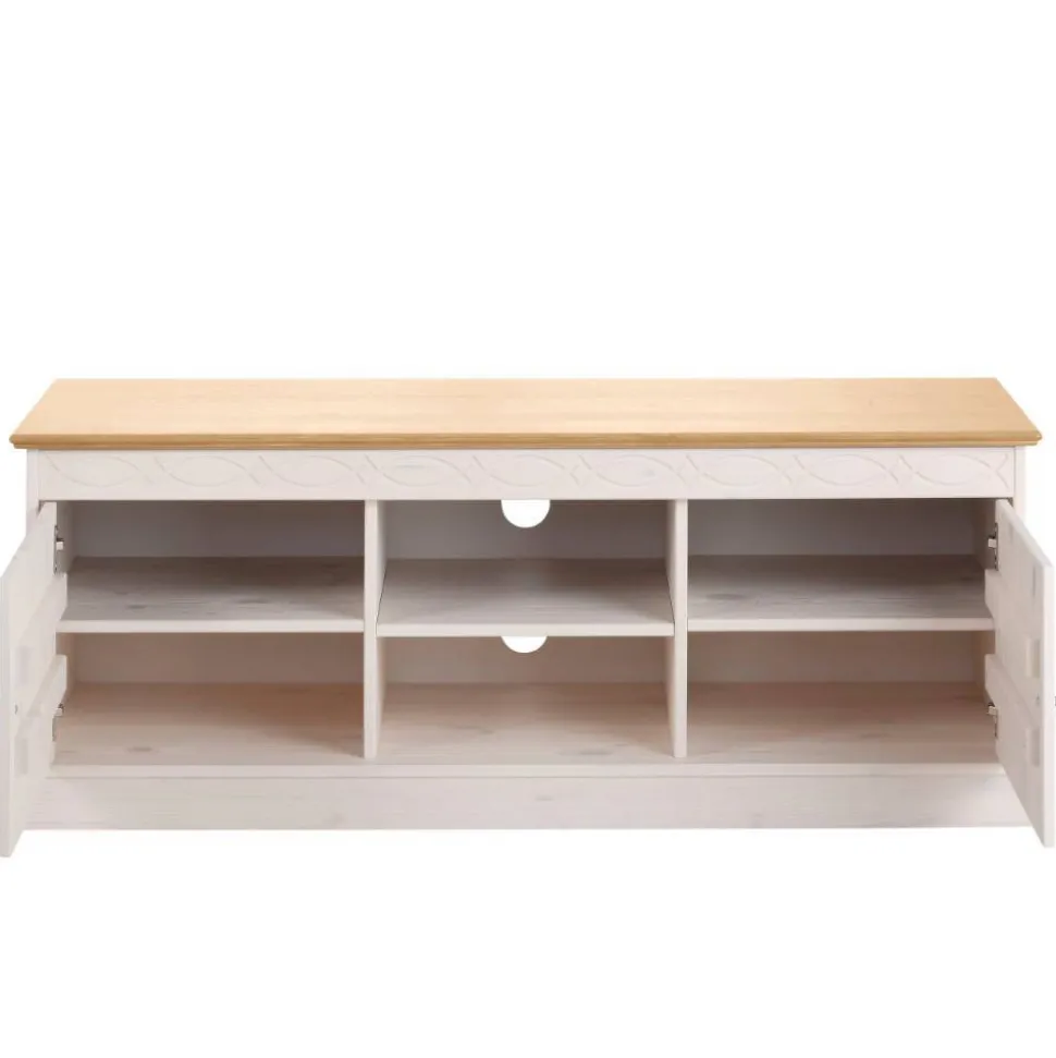 Die weiß lackierten Oberflächen lassen die lebendige Maserung des Kiefernholzes dezent durchscheinen und verleihen dem Möbel eine angenehm weiche, fast samtige Optik. Die honigfarbig abgesetzte Deckplatte setzt einen harmonischen Kontrast und bringt zusätzlich Wärme ins Design. Dieses Spiel aus Farbe und Material verleiht dem TV-Board eine authentische, wohnliche Ausstrahlung – als hätte es schon immer in Ihrem Zuhause gestanden.