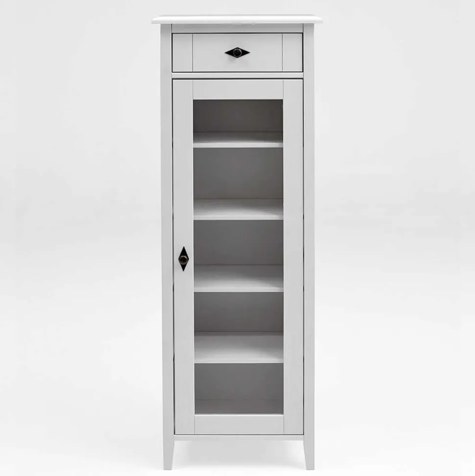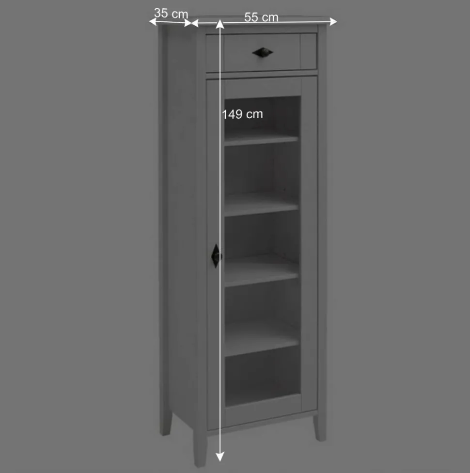 Mit ihren Maßen von 55 cm Breite, 149 cm Höhe und 35 cm Tiefe bietet die Vitrine reichlich Platz, um alle Ihre Badutensilien stilvoll zu verstauen. Der Schubkasten mit Metallauszug sorgt für leichtgängigen und geräuschlosen Zugriff auf Ihre Gegenstände. Hinter der Tür mit einem eleganten Glaseinsatz und hochwertigen Metallbeschlägen finden Sie vier verstellbare Einlegeböden, die flexible Aufbewahrungsmöglichkeiten bieten.