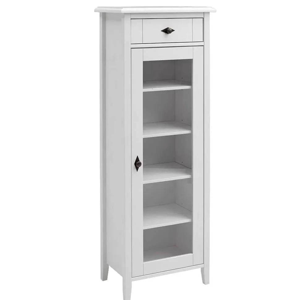 Die Oberflächen der Vitrine sind sorgfältig in Weiß lackiert, wodurch die natürliche Maserung des Holzes sanft durchscheint. Diese Lackierung schützt nicht nur das Holz, sondern unterstreicht auch seine natürliche Schönheit und macht das Möbelstück zu einem echten Hingucker in Ihrem Badezimmer.
