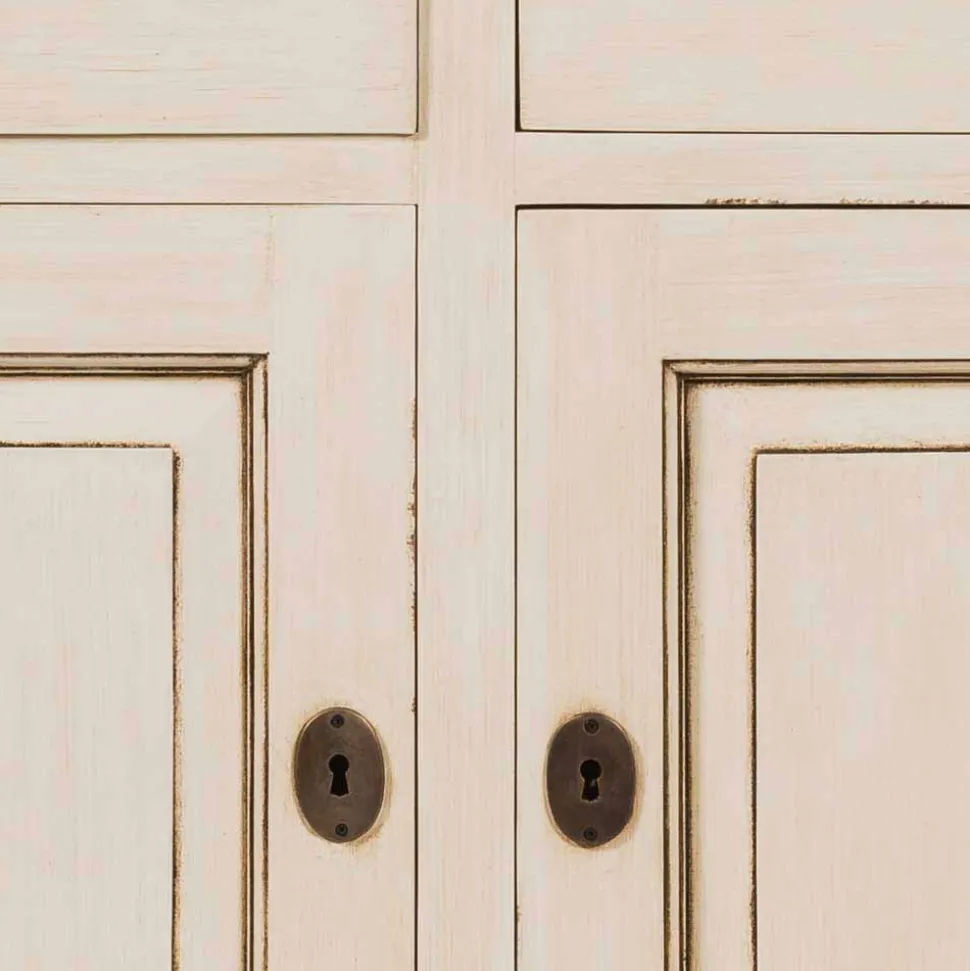 Mit einer Größe von 130 cm Breite, 220 cm Höhe und 45 cm Tiefe bietet die Vitrine „Helsing“ reichlich Stauraum für Ihr Ess- oder Wohnzimmer. Die vier abschließbaren Drehtüren, ausgestattet mit antikisierten Metallbeschlägen und -scharnieren, unterstreichen den nostalgischen Charme des Möbelstücks. Die oberen Türen sind mit elegantem Glaseinsatz versehen, wodurch Ihre Lieblingsstücke stilvoll präsentiert werden können.