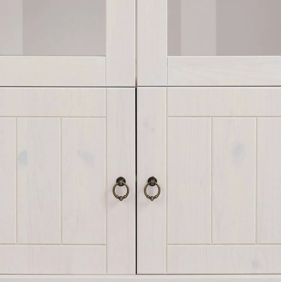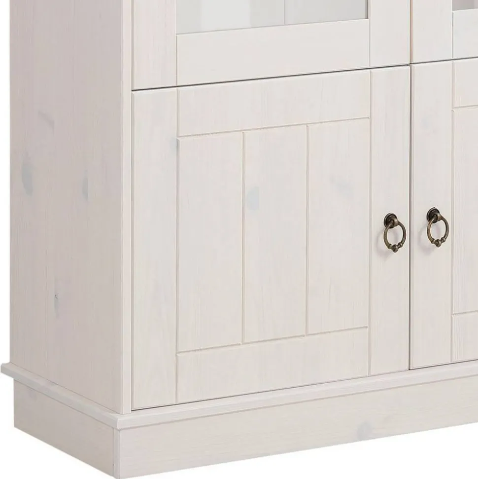Gefertigt aus massivem Kiefernholz, überzeugt diese Vitrine nicht nur durch Robustheit, sondern auch durch eine ganz besondere Haptik. Die Oberfläche ist weiß lackiert, wobei die feine, natürliche Maserung des Holzes sanft durchscheint. Dieses Spiel aus Licht und Struktur verleiht dem Möbel seine einzigartige Seele. Kiefernholz begeistert durch seine lebendige Struktur, hohe Stabilität und das natürliche Spannungsfeld, das jedes Möbelstück zum Unikat macht. Kleine Risse und Wölbungen sind hier keine Makel, sondern charmante Spuren der Natur, die Authentizität und Charakter verleihen.