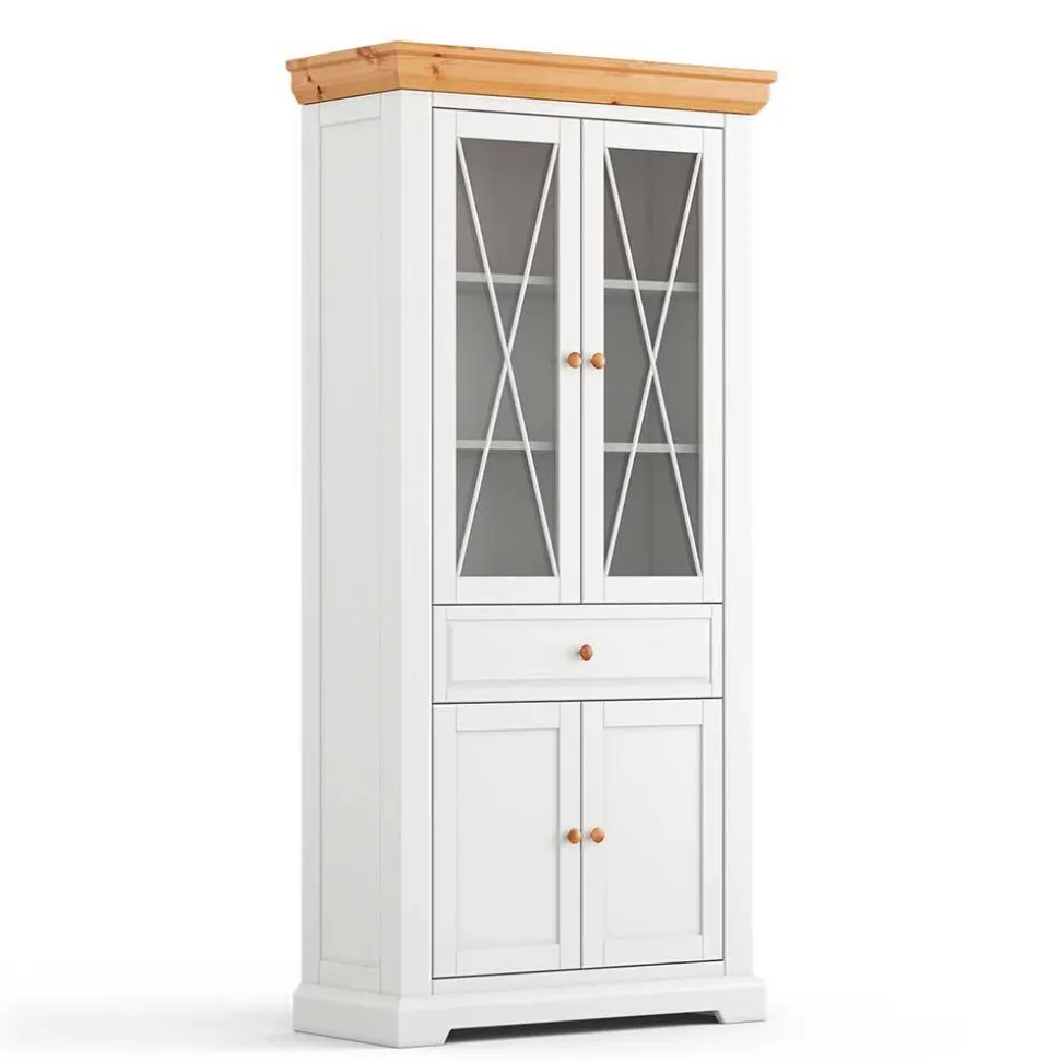 Dieser Schrank ist aus massivem Kiefernholz gefertigt, bekannt für seine Langlebigkeit und warme Ausstrahlung. Kiefernholz ist nicht nur robust, sondern auch ästhetisch ansprechend mit seiner markanten Maserung. Das Glas in den oberen Türen ergänzt das Holz perfekt und verleiht dem Schrank eine elegante Leichtigkeit.