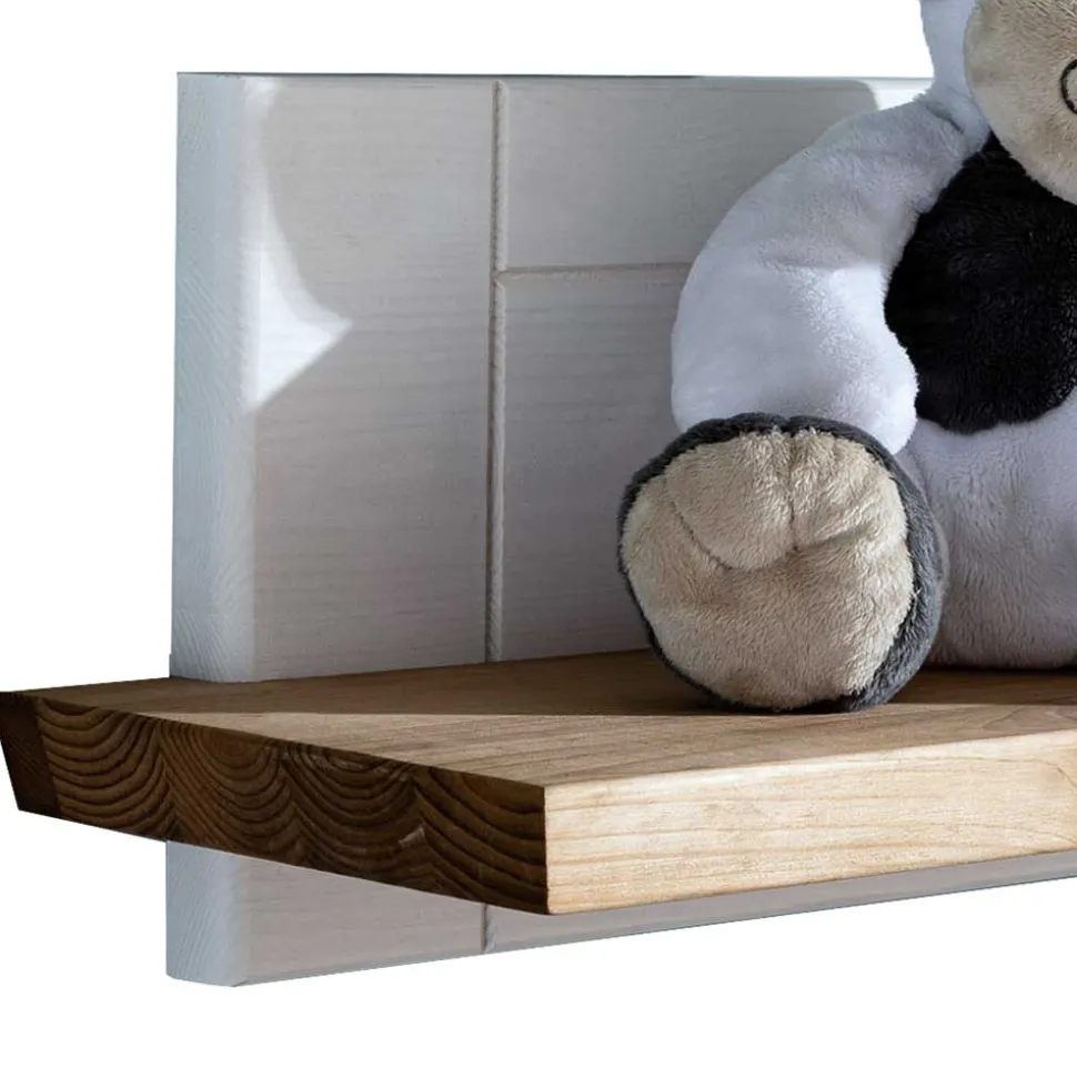 Die Oberfläche des Wandboards ist in einem strahlenden Weiß gewachst, das seine feinen Holzstrukturen sanft durchschimmern lässt. Dies schafft ein harmonisches Gesamtbild und betont den natürlichen Charme des Kiefernholzes. Die Ablage setzt sich gekonnt in Szene durch eine eichefarbige Beizung, die zusätzlich geölt wurde. Dies schützt das Holz vor Feuchtigkeit und Verschmutzungen und verleiht ihm gleichzeitig eine edle, matte Optik.