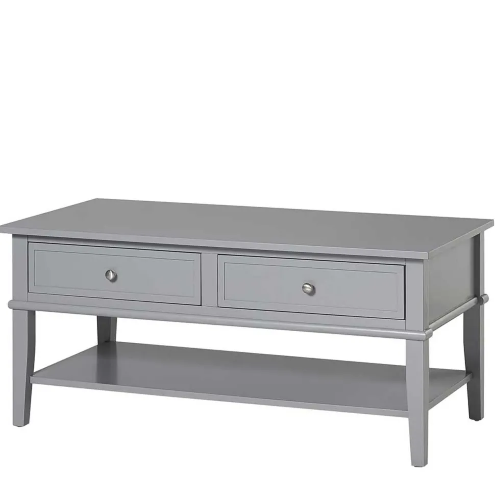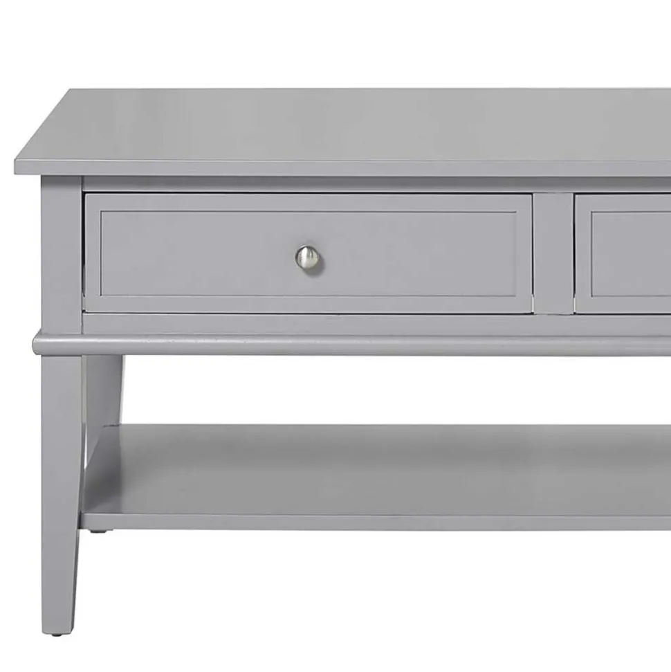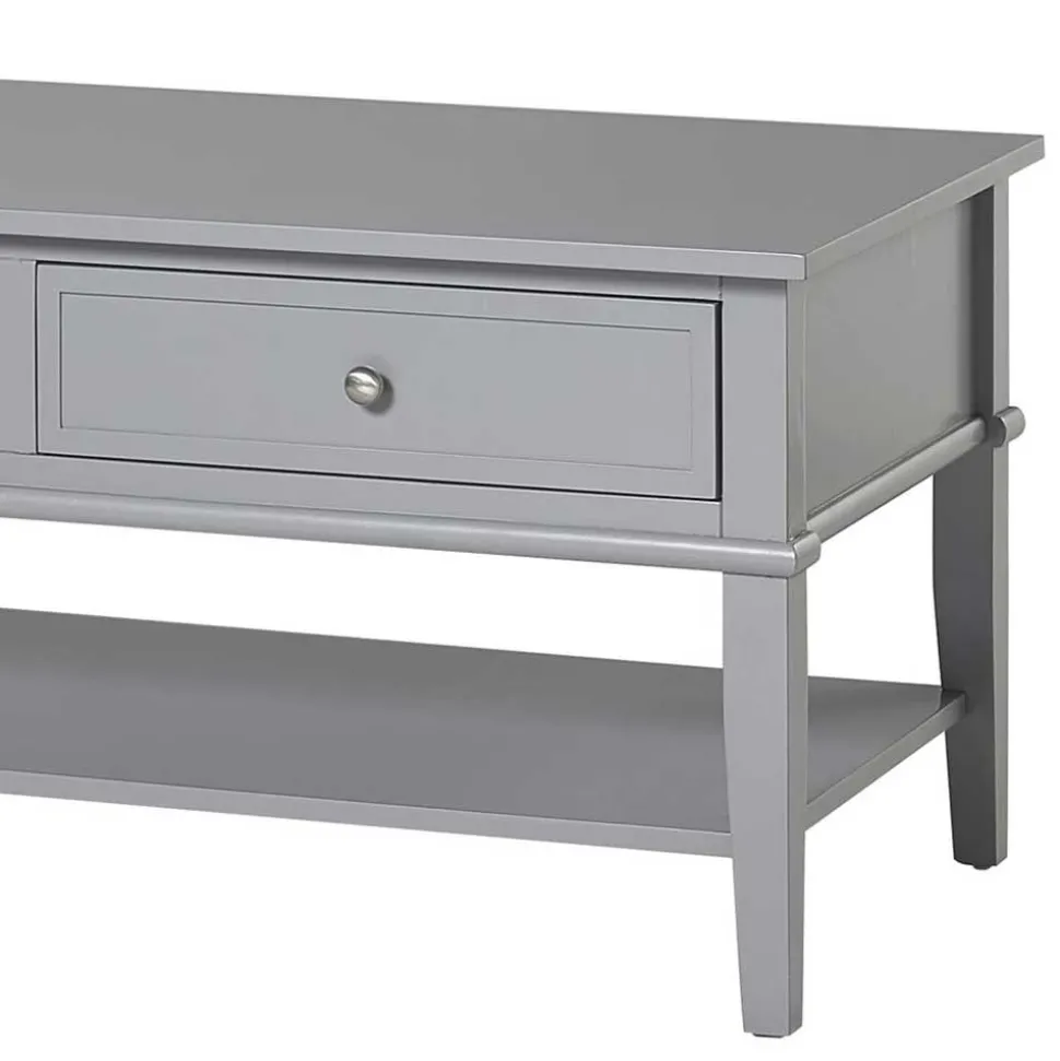 Die Basis für diesen tollen Couchtisch bildet eine erstklassige Verarbeitung aus Massivholz und MDF. Stabilität ist hier keine Frage, sondern selbstverständlich – vier massive Holzbeine tragen diesen Tisch mit Leichtigkeit und verleihen ihm eine beeindruckende Standfestigkeit. Die Oberfläche ist in einem zeitlosen Grau lackiert und erhält durch dezente, silberfarbene Knopfgriffe aus Metall einen modernen Touch.