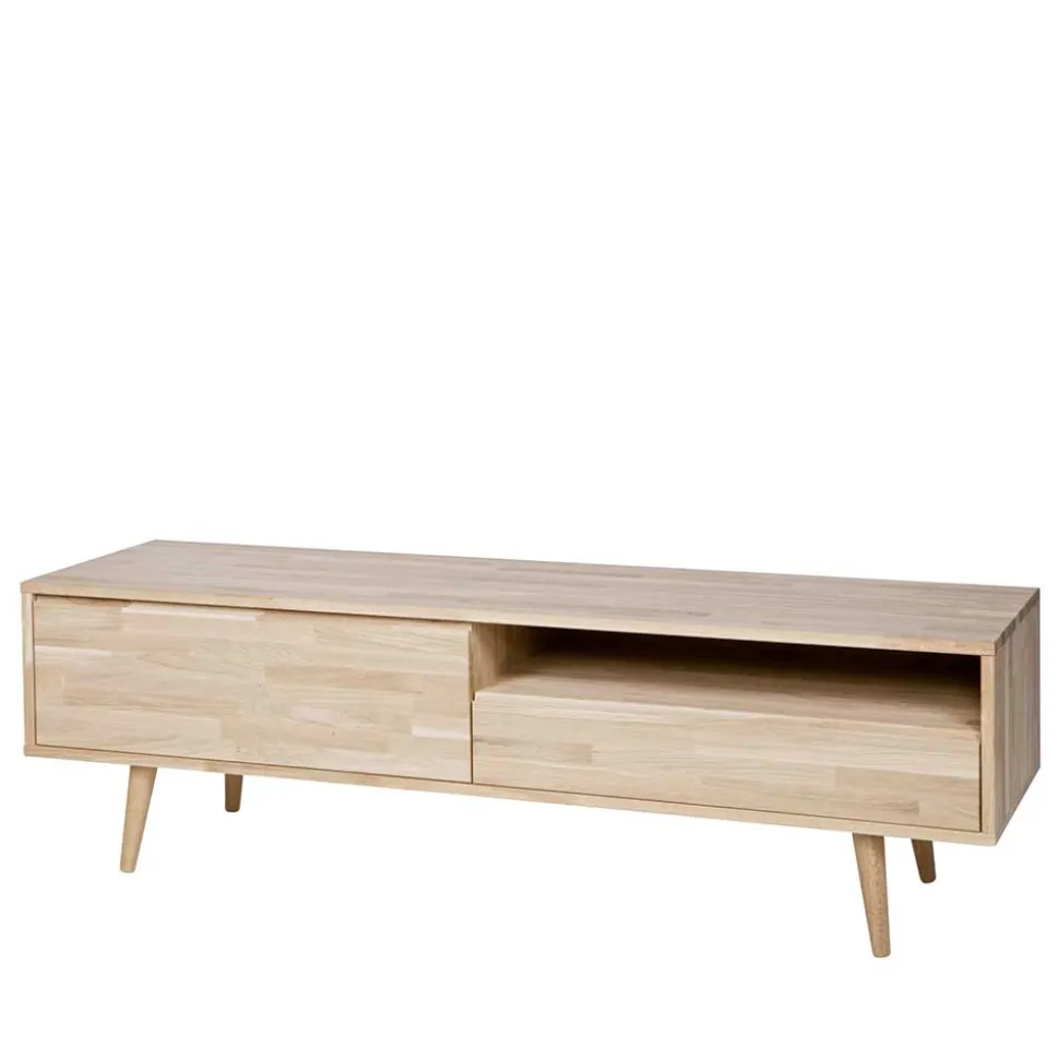 Die vier konisch zulaufenden Beine, leicht schräg gestellt, verleihen dem Lowboard eine leichte und moderne Ausstrahlung, die durch die feine, unbehandelte Oberfläche des Holzes noch unterstrichen wird. Diese sorgfältige Verarbeitung garantiert nicht nur eine ansprechende Optik, sondern auch eine lange Lebensdauer Ihres neuen Möbelstücks.