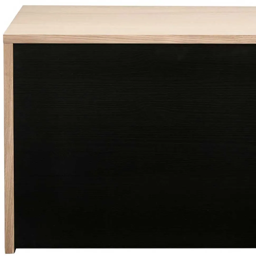 Das Lowboard wurde aus einer hochwertigen Kombination aus Massivholz und Spanplatte gefertigt. Die robuste Front besteht aus echtem Massivholz und wurde sorgfältig lackiert, um die natürliche Maserung zu betonen. Der Korpus sowie die Inneneinteilung bestehen aus furnierter Spanplatte, die außen mit einer schützenden Lackierung veredelt und innen mit einer pflegeleichten, grauen Melaminbeschichtung versehen wurde. Diese Materialwahl sorgt für eine lange Lebensdauer und eine besonders einfache Reinigung.