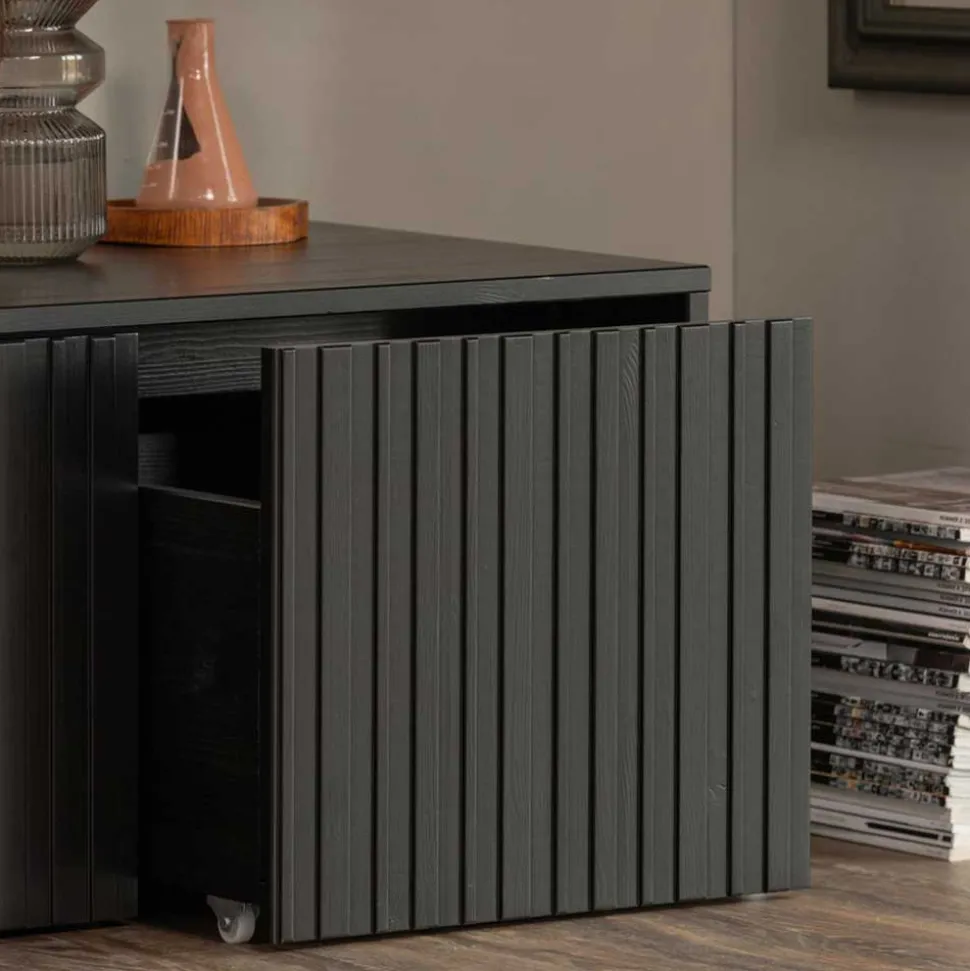 Das Lowboard „Gelvins“ setzt markante Akzente und überzeugt mit einer gelungenen Mischung aus Funktionalität und Design. Die tiefschwarze Kiefernholz-Optik verleiht dem Möbelstück eine ausdrucksstarke Präsenz, während die vertikalen Rillen auf der Front für eine besondere Dynamik sorgen. Ob als TV-Board im Wohnzimmer oder als stilvolle Stauraumlösung im Flur – dieses Möbelstück ist ein echter Hingucker und fügt sich perfekt in moderne sowie skandinavisch inspirierte Wohnkonzepte ein.