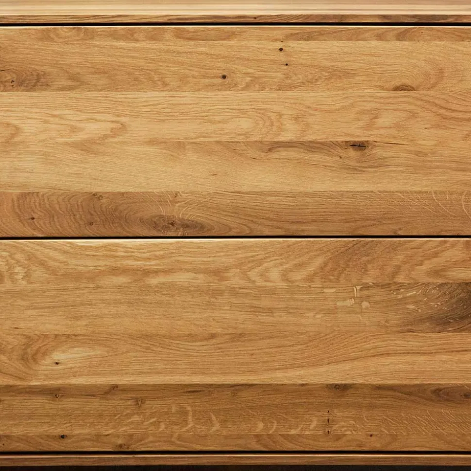 Das Lowboard „Manzey“ hat ein natürliches Design mit klaren Linien, welches perfekt in jede moderne Einrichtung passt. Hergestellt aus massiver Wildeiche (durchgehende Lamellen) und Stahl, bietet dieses Möbelstück erstklassige Qualität und Verarbeitung. Die Holzoberfläche ist natürlich geölt, um die natürliche Schönheit des Holzes zu betonen.