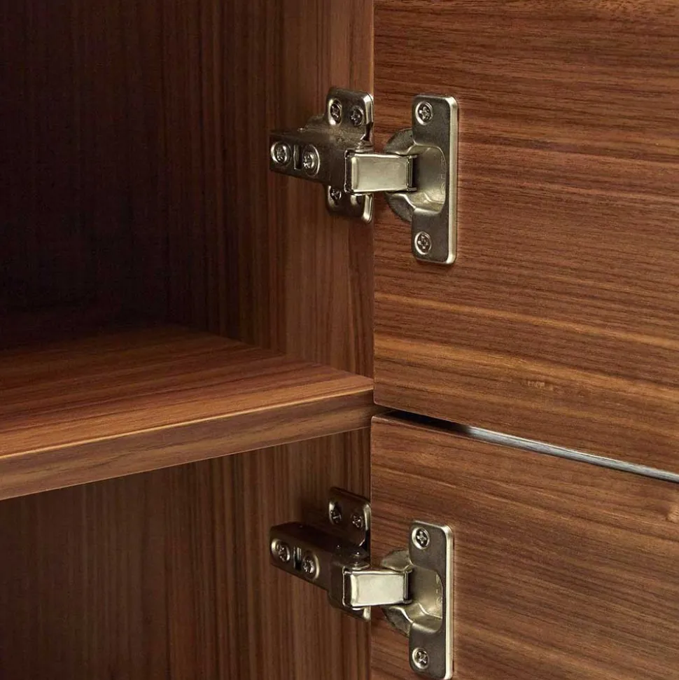 Die Holzoberflächen der Kommode „Milena“ sind aus erstklassigem Holzwerkstoff (MDF) gefertigt, der für seine Stabilität und Langlebigkeit bekannt ist. MDF ist ein Material, das sich durch seine hohe Dichte und Homogenität auszeichnet, wodurch es besonders widerstandsfähig gegen Feuchtigkeit und Verformungen ist. Die Nussbaumfarben echtholzfurnierten Oberflächen verleihen der Kommode eine natürliche und warme Optik, die jeden Raum aufwertet. Die Echtholzfurnierung bringt die einzigartige Maserung und Struktur des Holzes zur Geltung, während die Lackierung die Oberflächen zusätzlich schützt und ihnen einen dezenten Glanz verleiht. Dies sorgt nicht nur für eine edle Optik, sondern auch für eine pflegeleichte und robuste Oberfläche, die den täglichen Gebrauch problemlos übersteht.