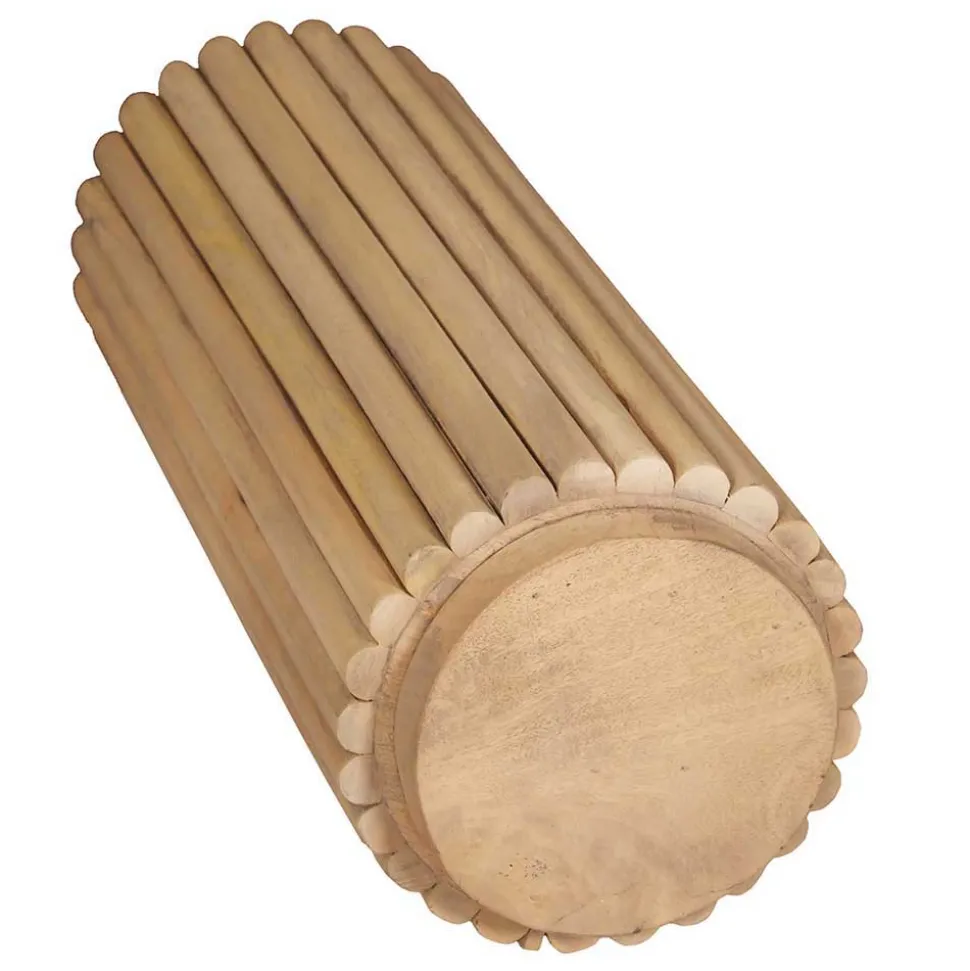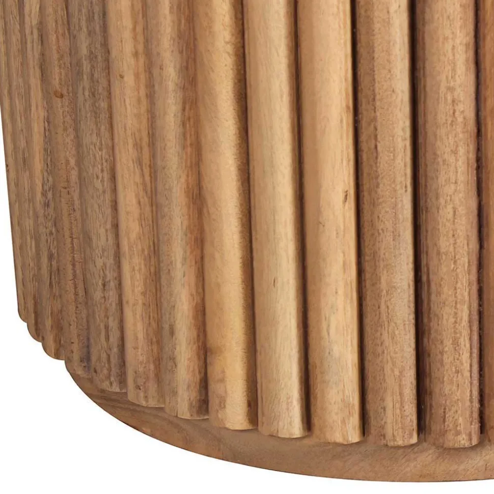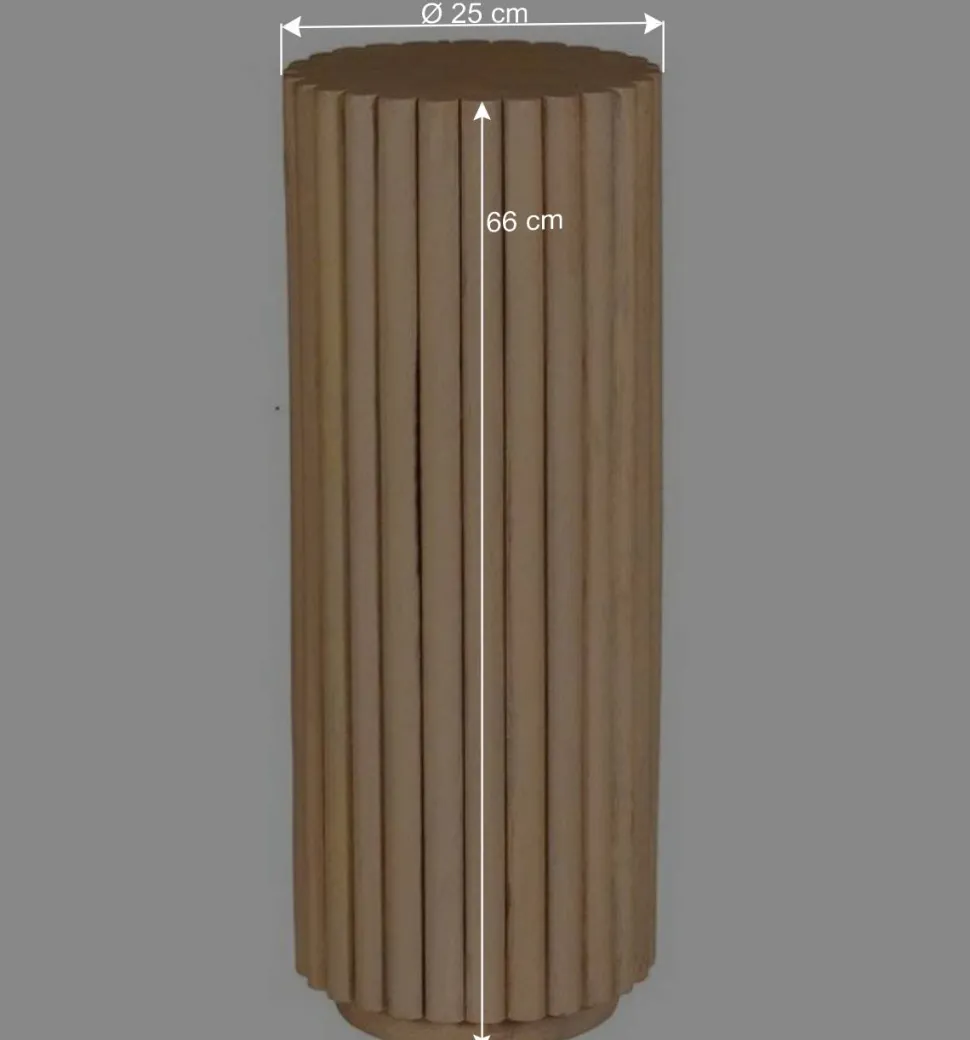 Die Säule besticht durch eine plastische Rippenoptik, die durch die umlaufenden Halbrundhölzer entsteht. Diese schließen bündig mit der runden Ablagefläche ab und fügen sich nahtlos in das Gesamtdesign ein. Der nach innen versetzte Sockel mit einer Höhe von ca. 3 cm sorgt für sicheren Stand und unterstützt die schlanke Silhouette der Säule.