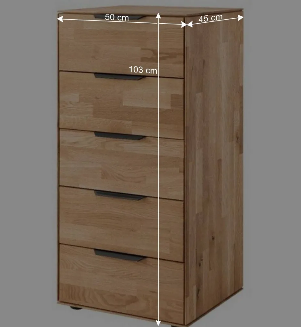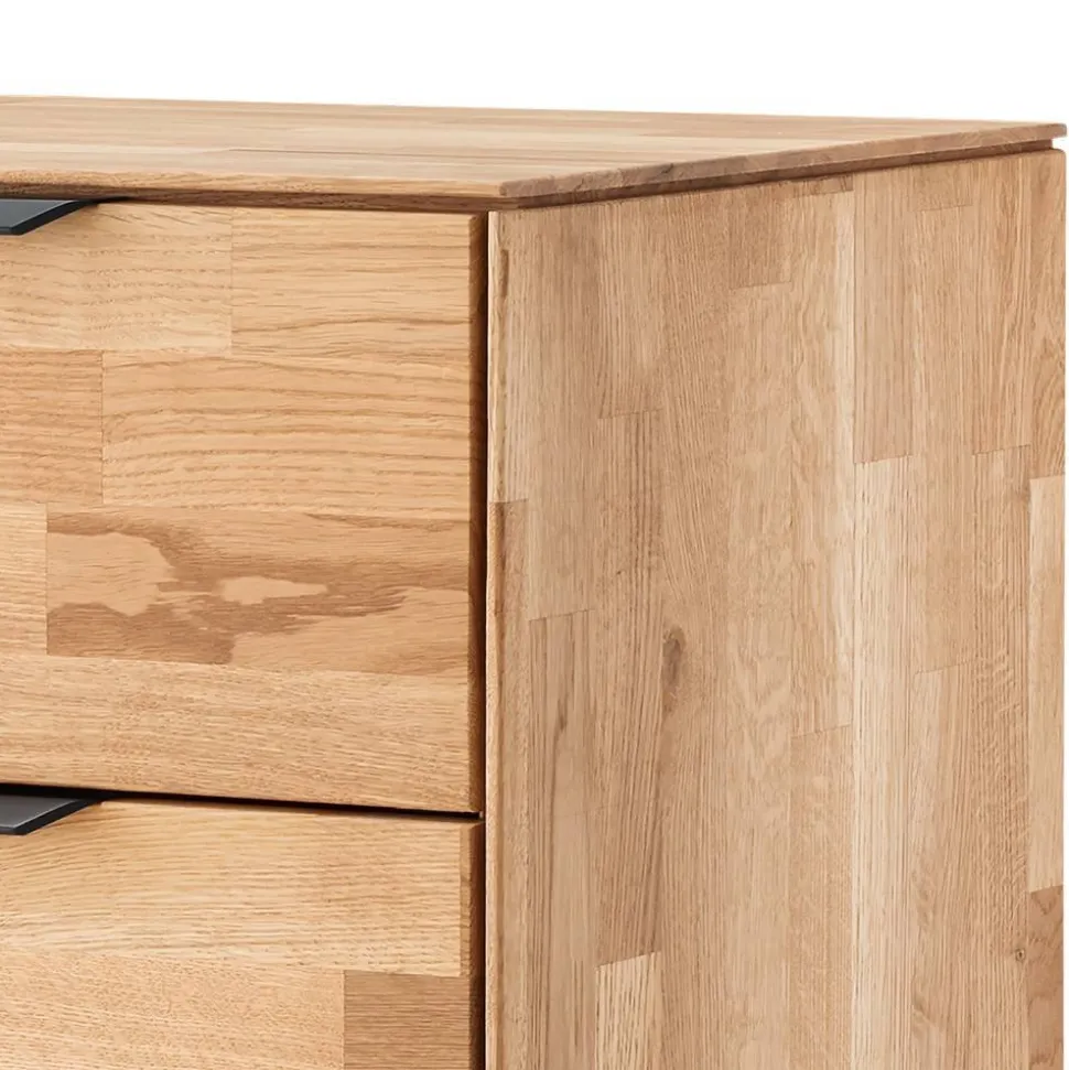 Mit fünf großzügigen Schubladen bietet die „Kassanda“ reichlich Stauraum für Kleidung, Wäsche oder Alltagsgegenstände. Dank der Metallauszüge mit Soft-Close-Technik schließen alle Schubladen sanft und leise. Besonders edel wirken die schwarz eloxierten Kantengriffe aus Aluminium – sie ergänzen das natürliche Wildeichenholz perfekt. Die Griffe werden separat geliefert und lassen sich im Handumdrehen montieren.